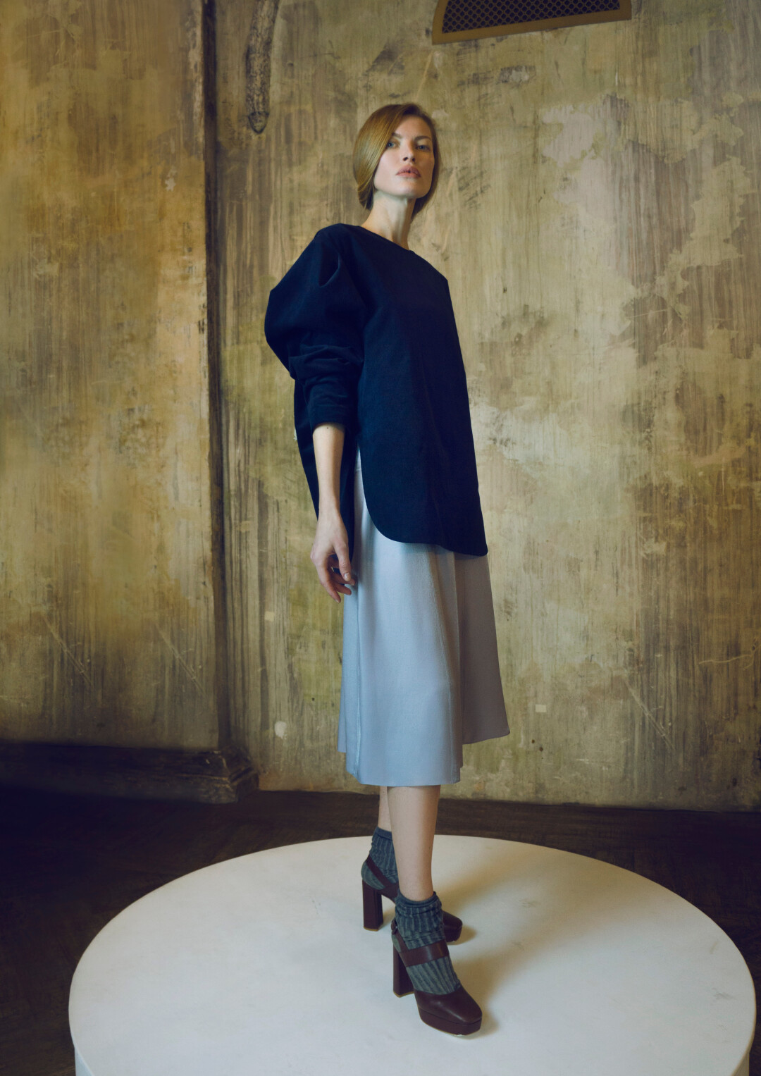 Это платье из струящейся вискозы посвящено последней российской императрице. Длинное, немного расширяющееся к низу, оно дополнено рельефными деталями на бедрах. Для этого платья мы выбрали два сложных цвета: глубокий черный и французский серый с едва уловимым серо-сизым оттенком. В движении ткань переливается и мерцает.