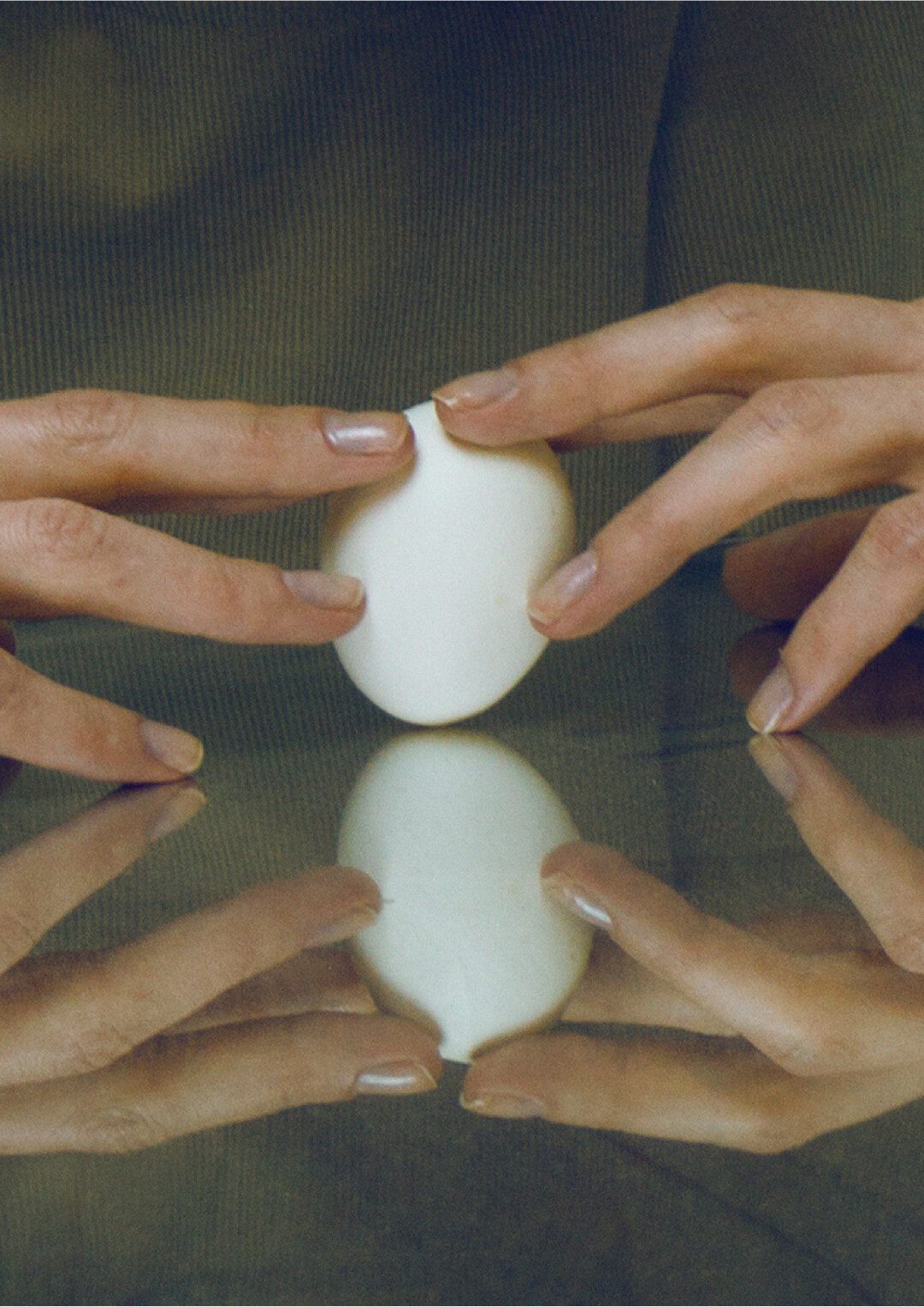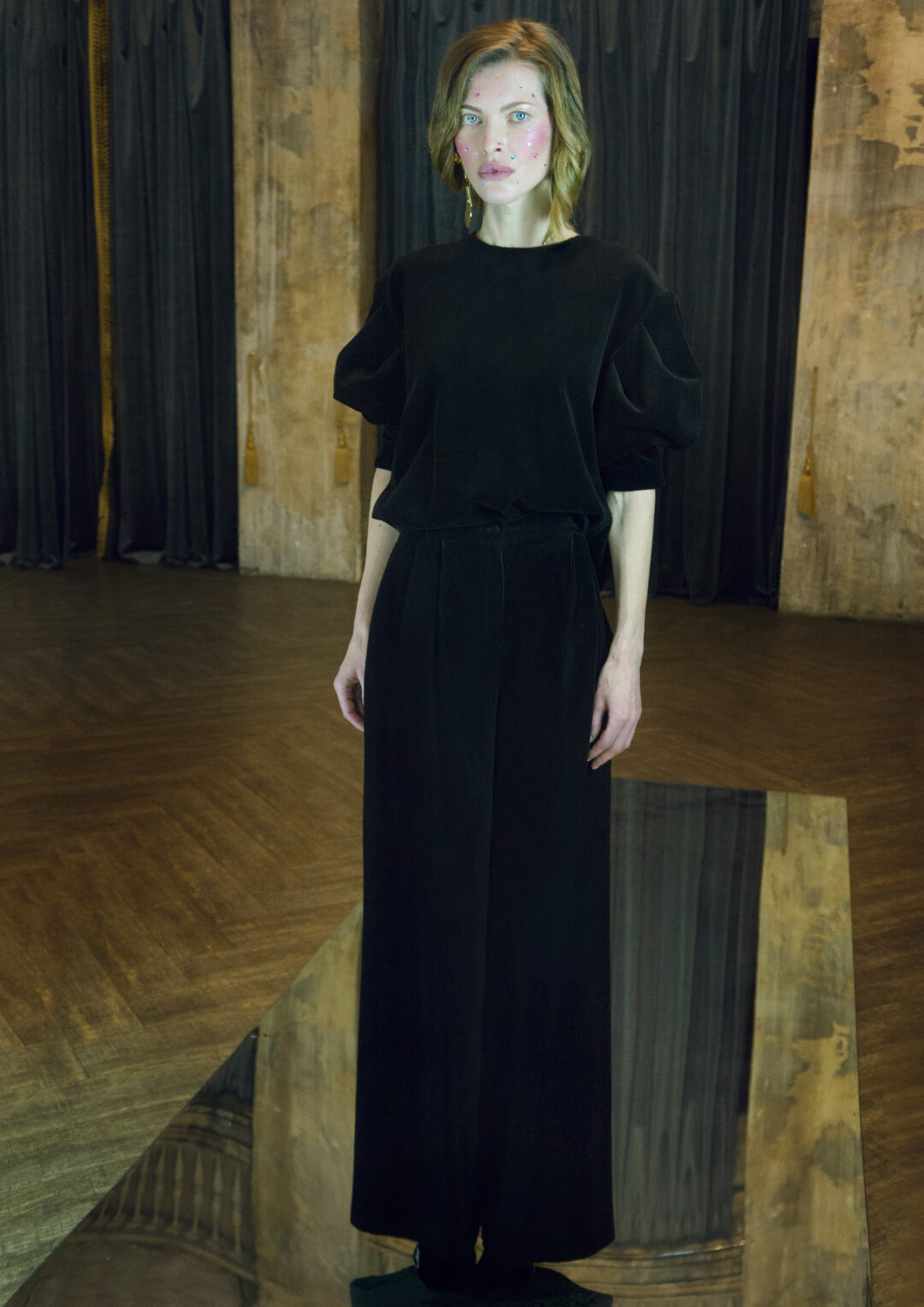 Та самая вещь из коллекции, которая напрямую связана с подарком Александра III. Это подтверждает стилизованное изображение яйца «Ландыши» на спине свитшота. Рисунок выдержан в стиле модерн. Покрытое полупрозрачной розовой эмалью по гильошированному фону, яйцо находится на золотой подставке с четырьмя утонченными ножками. Если рукава свитшота перекликаются с этими изящными S-образными ножками, то его форма отсылает к образу драгоценного яйца. А то, как вельвет раскрывает глубину своего цвета при разном освещении, напоминает о чудесной эмали — скорлупе яйца.
