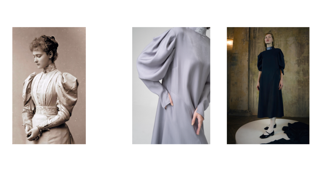 Рукава платья со складками отсылают к нарядам Александры Федоровны. Объемные у плеча и зауженные книзу, они имеют разрез в районе большого пальца, благодаря которому кисть выглядит элегантно и женственно. Воротник-стойка так же, как и у платья «Мария Федоровна», украшен «билетом» со стилизованным изображением имперской короны.