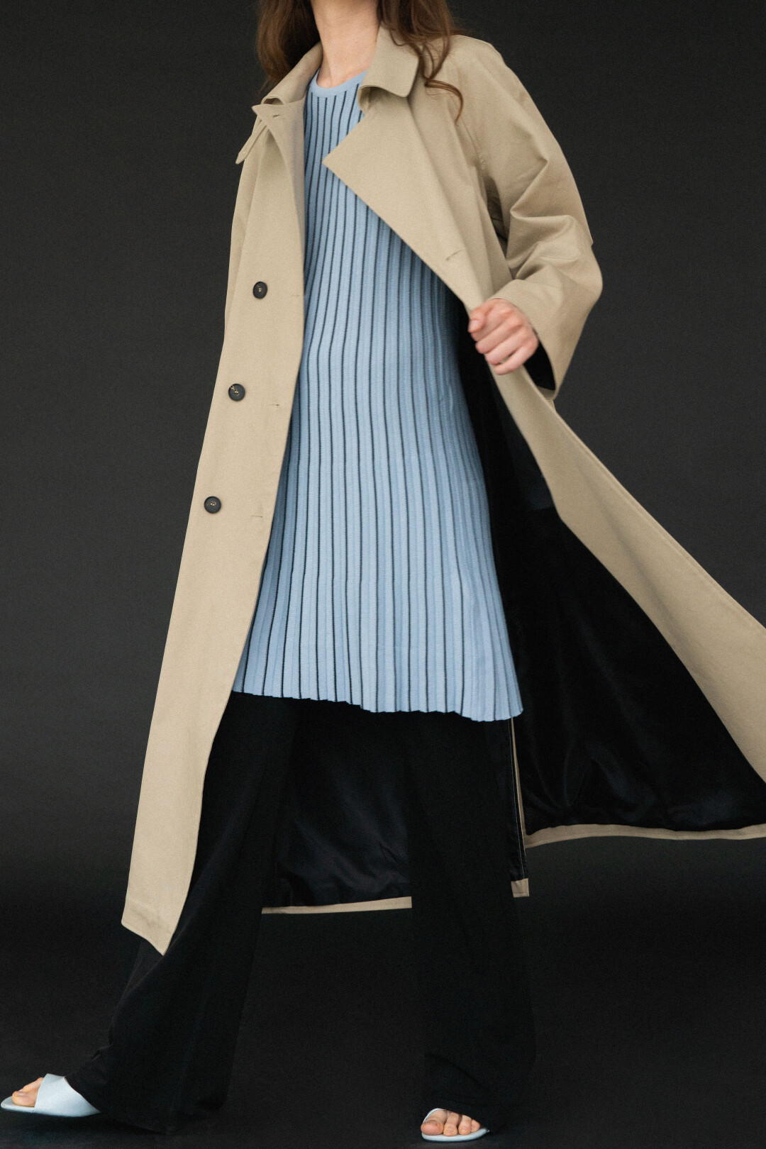 Все вещи традиционного для марки лаконичного и функционального дизайна. Это объемные тренчи классического силуэта с архитектурными деталями: воротником-стойкой с заостренными лацканами, отлетной кокеткой и широким съемным поясом. Кроме того, дроп дополнили мюли с квадратным носком из кожи наппа. Над обувью FLÜG работали вместе с петербургской студией обуви ручной работы MISLISTUDIO.