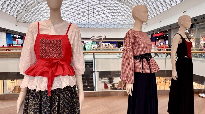 «В каждом стежке — память»: в торговом центре открылась выставка с костюмами на стыке народного искусства и моды