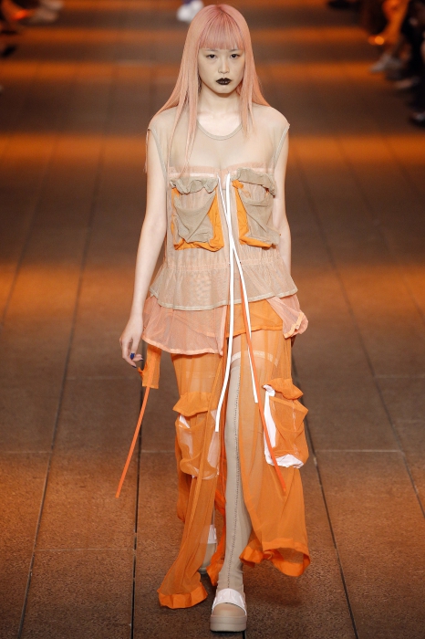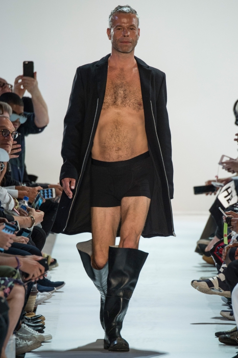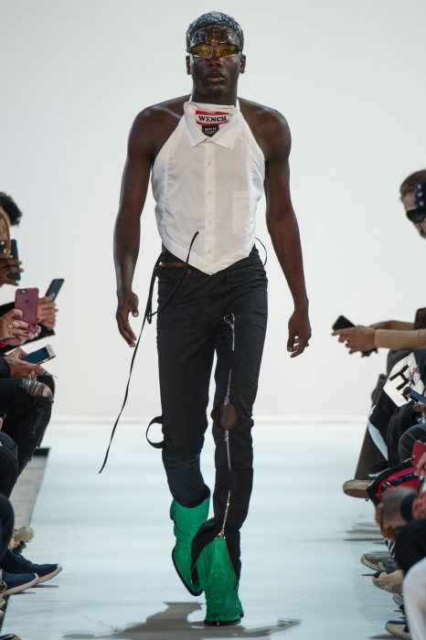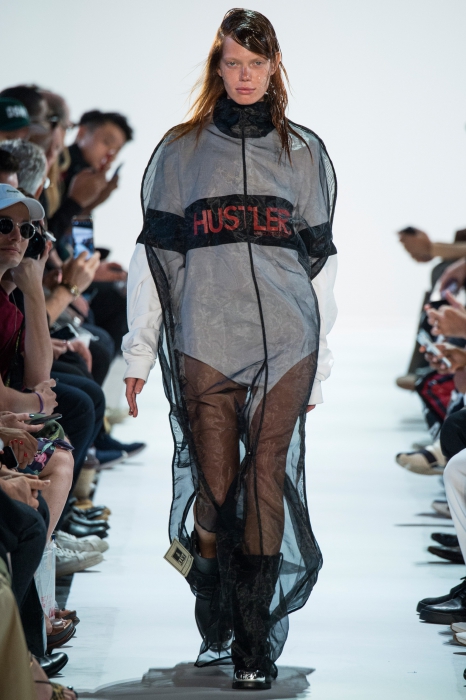 Если не знать, что для создания весенне-летней коллекции Hood by Air объединилились с порносайтом Pornhub, то работу Шейна Оливера можно понять неправильно. Сотрудничество бренда с Pornhub вылилось в футболки с логотипом сайта, а также в вещи с надписями «Hustler», «Wench» и «Do you know where your children are?». Если убрать надписи, то получится классическая для HBA коллекция: многослойные комплекты, цитаты уличной культуры, винил и полное стирание гендерных границ. Вау-эффект шоу обеспечили два момента: выход художника Вольфганга Тильманса и казаки «иду-куда-хочу» с носами, расположенными и впереди, и сзади.