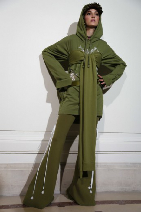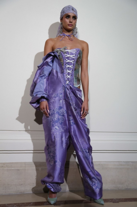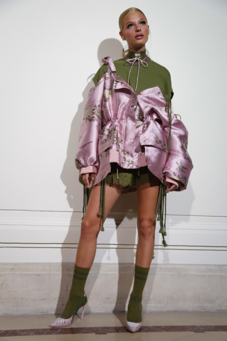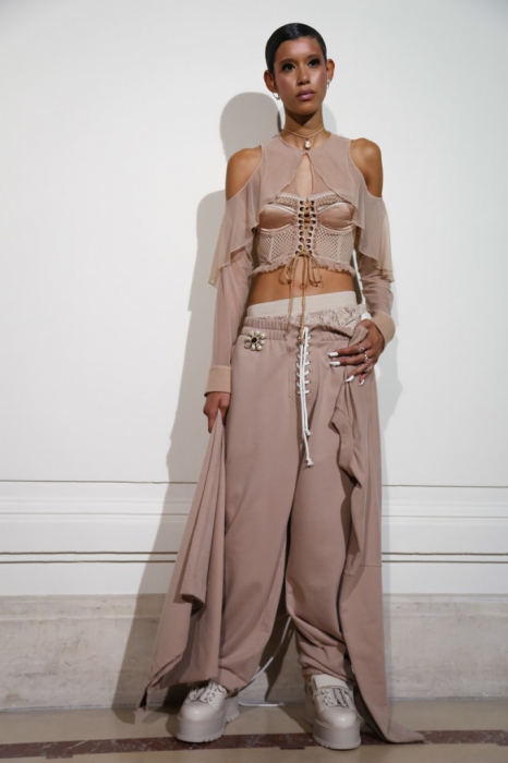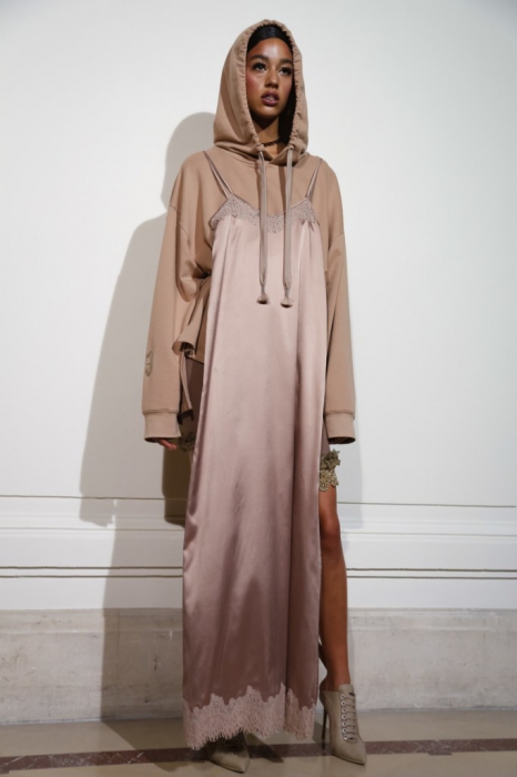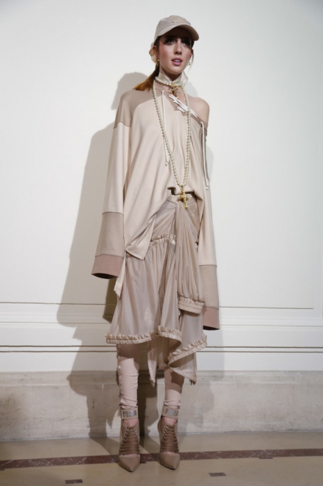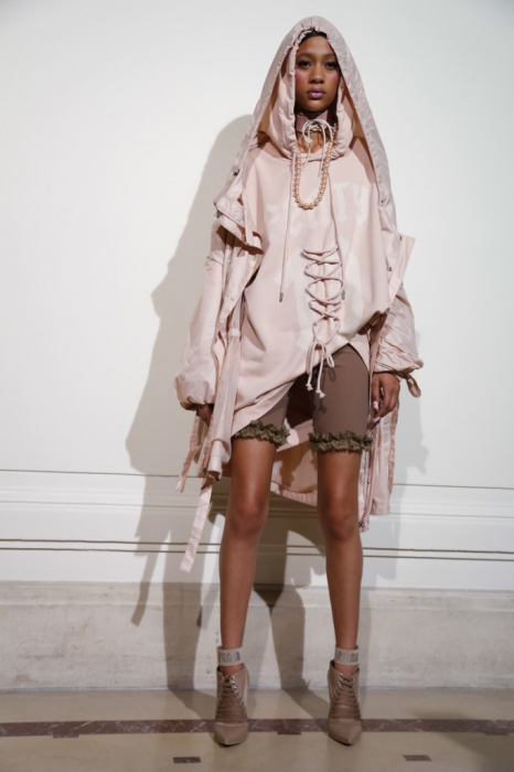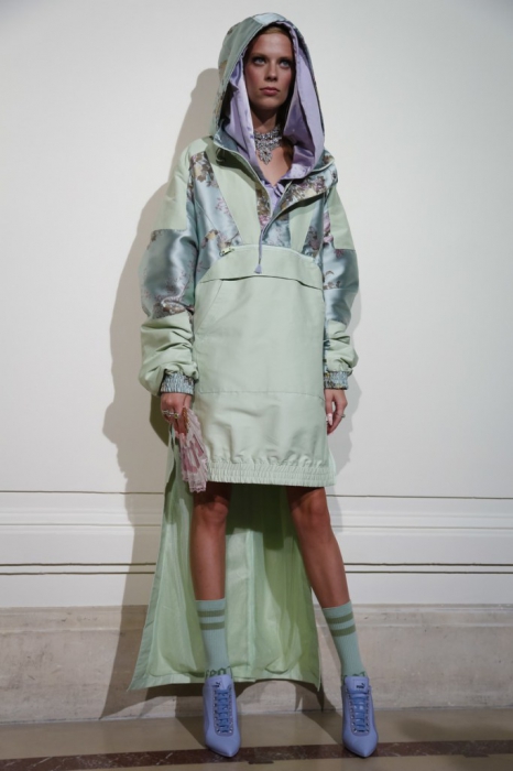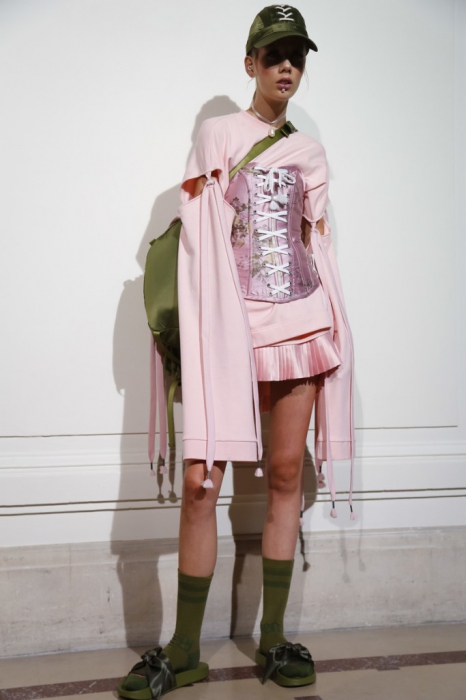 На свитшотах пастельных оттенках — элементы рококо-корсетов, а на кружевных топах, наоборот, — завязки, как на худи. Розовые парки имитируют крой платьев королевы, а лучший стайлинг для них – это жемчуг на шее и руках.