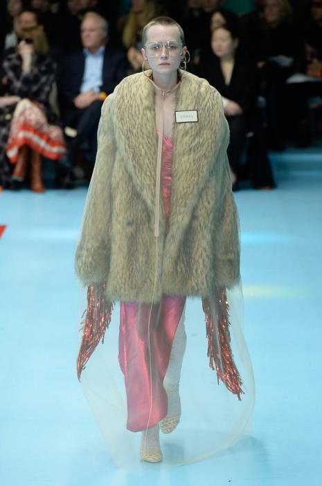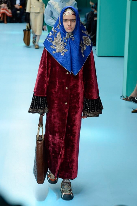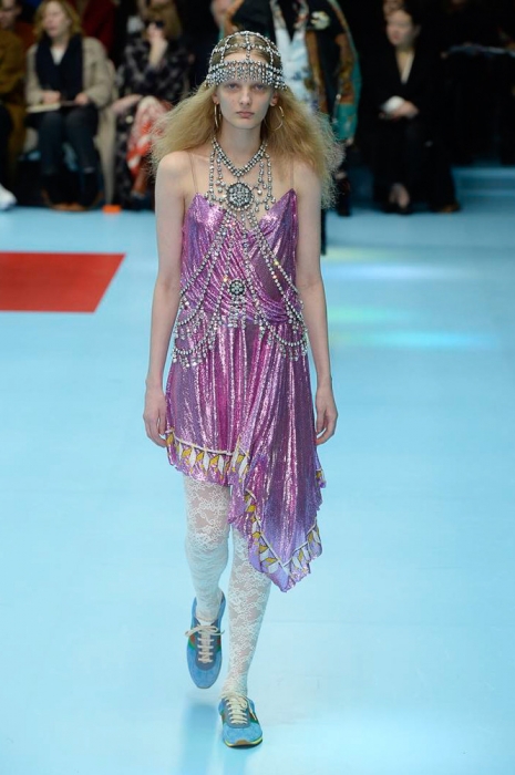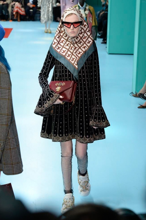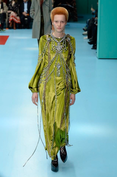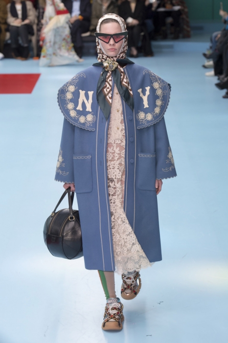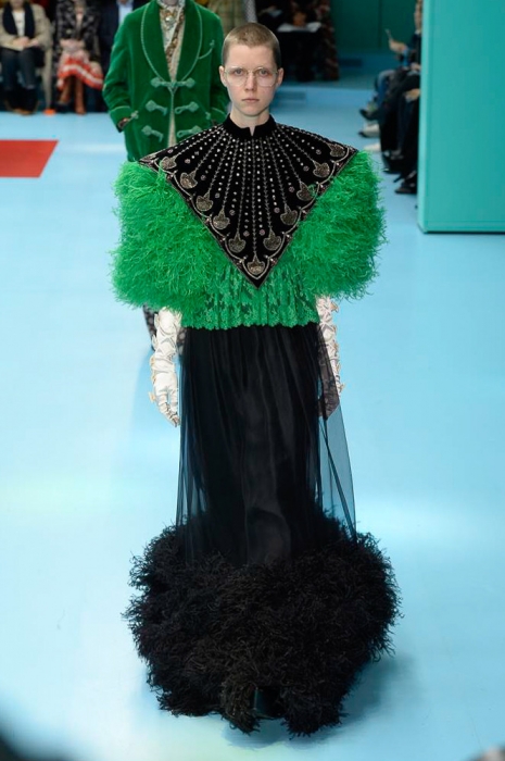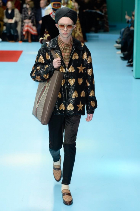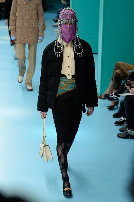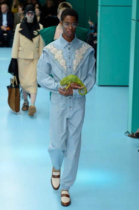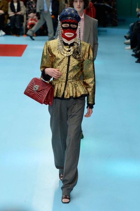 Среди других оммажей осенне-зимней коллекции — среднеазиатские национальные костюмы, японские аниме-мультфильмы, винтажные украшения ювелира Хэтти Карнеги, голливудский конвейер Paramount Pictures, конный спорт и сериал «Игра Престолов» — вместо сумок модели несли драконов, ящериц и змей. Сомневаемся, что они будут продаваться вместе с тюрбанами-балаклавами, топом из цепочек, бейсболками из коллаборации Gucci и New York Yankees, свитшотом «Kill Pussycat» и костюмами в защитных чехлах, но уже готовы назвать «питомцев» самой милой задумкой Алессандро Микеле.