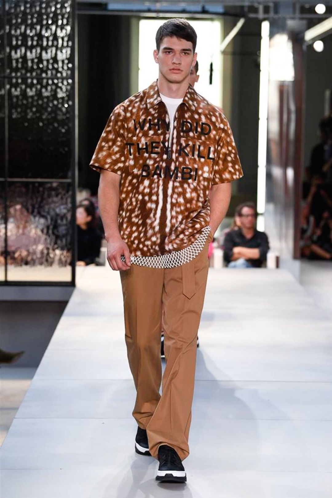 В ней Рикардо уважил всех: любительниц минимализма — костюмами-тройками естественных оттенков, фанатов британской классики — плащами всех форм и конструкций, авангардисток — юбками с фотопротретами, хайпбистов — сандалиями, которые круче кроссовок, а сторонниц PETA — пятнистыми рубашками с надписью «За что они убили олененка Бэмби?». При этом Тиши не изменил ни ДНК бренда (тренчи появлялись практически в каждом выходе, а фирменная расцветка раскрасила не только клетчатые рубашки, но и полосатые блузки), ни самому себе. Его любимые платья-ночнушки наделены аристократичными рукавами на английский манер, а архитектурные жакеты и длинные черные наряды вышли под занавес шоу, намекая на появление на грядущем «Эмми».