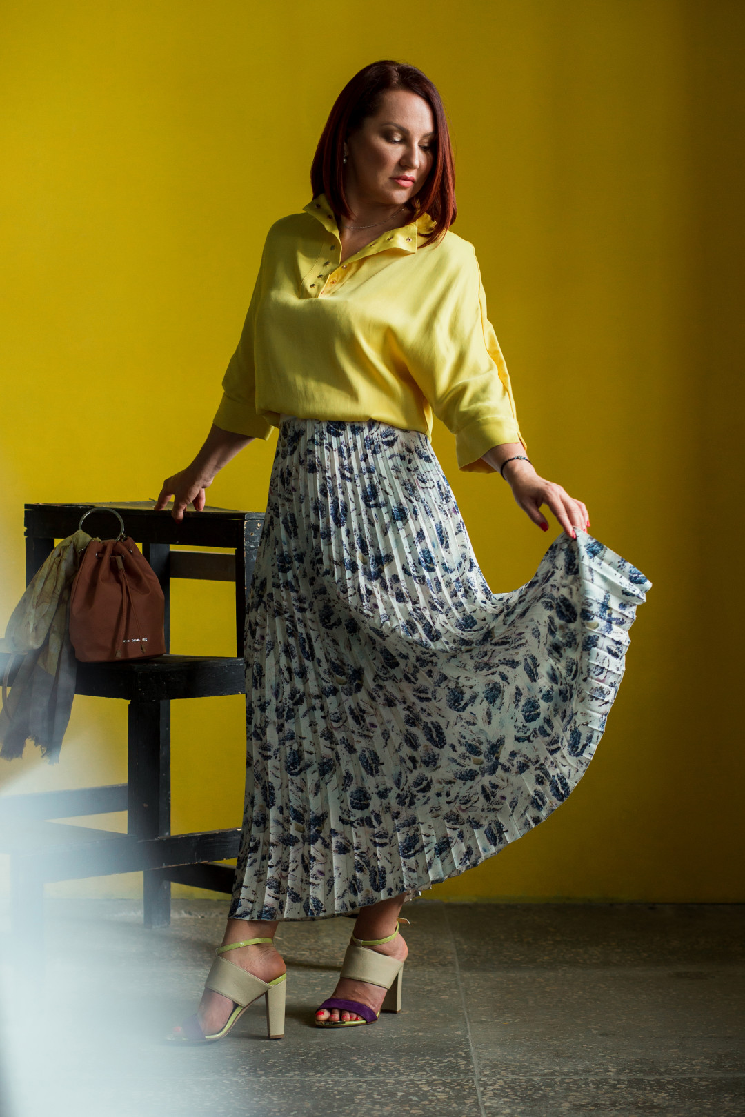 Рано списывать плиссировку со счетов: оказалось, что этот тренд стал чуть ли не одним из главных в летнем сезоне. У вас нет выхода, кроме как полюбить юбки в мелкую женственную складку. Сочетайте плиссировку с гладкими фактурами, как в нашем случае, с блузой оптимистичного хризантемного цвета.