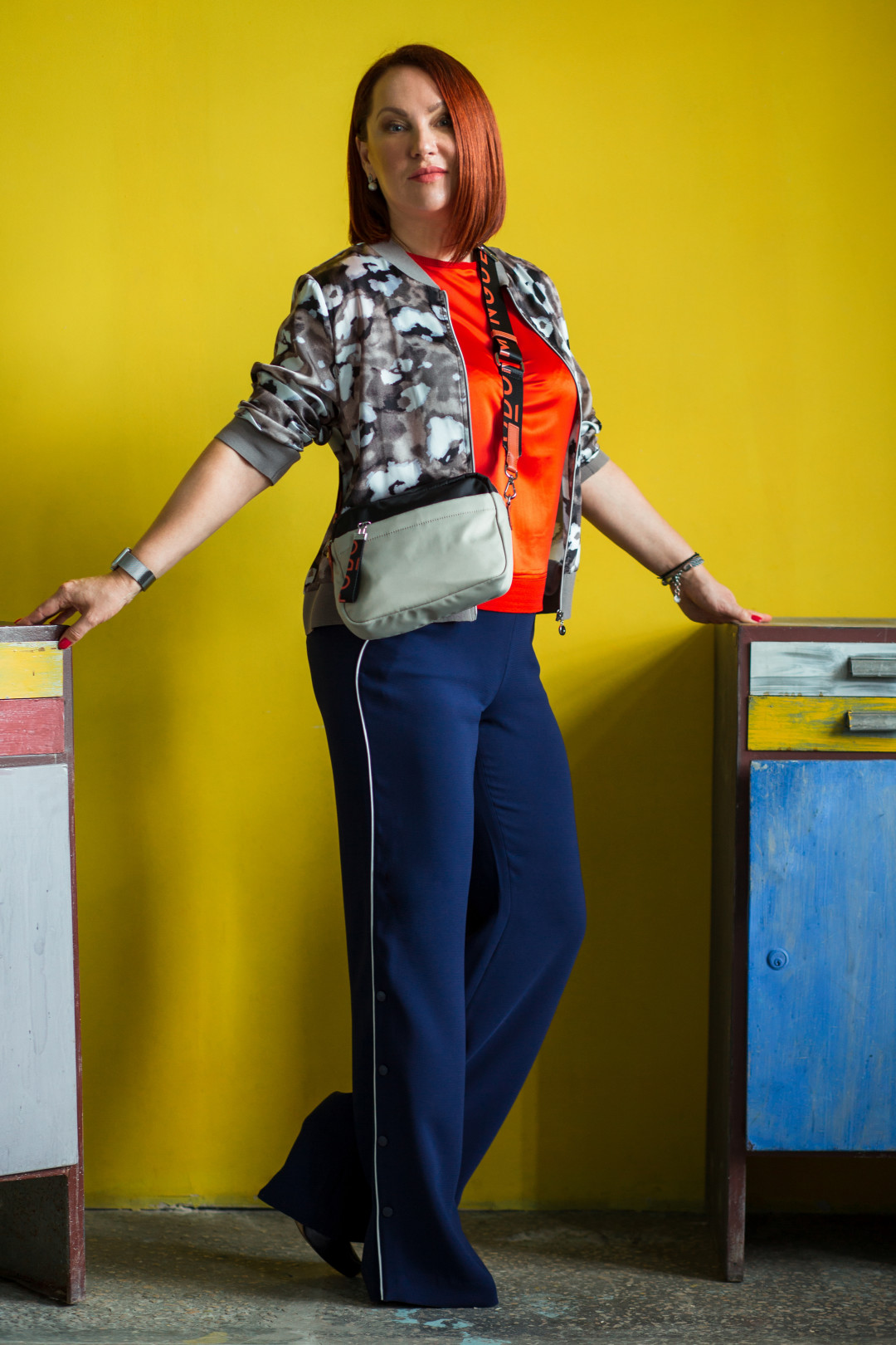 Модный городской лук создаем путем микса вещей в стиле спорт-шик. Шелковый бомбер, плюс брюки с лампасами, плюс сумочка с широким ремнем и образ жительницы урбанистических джунглей готов!