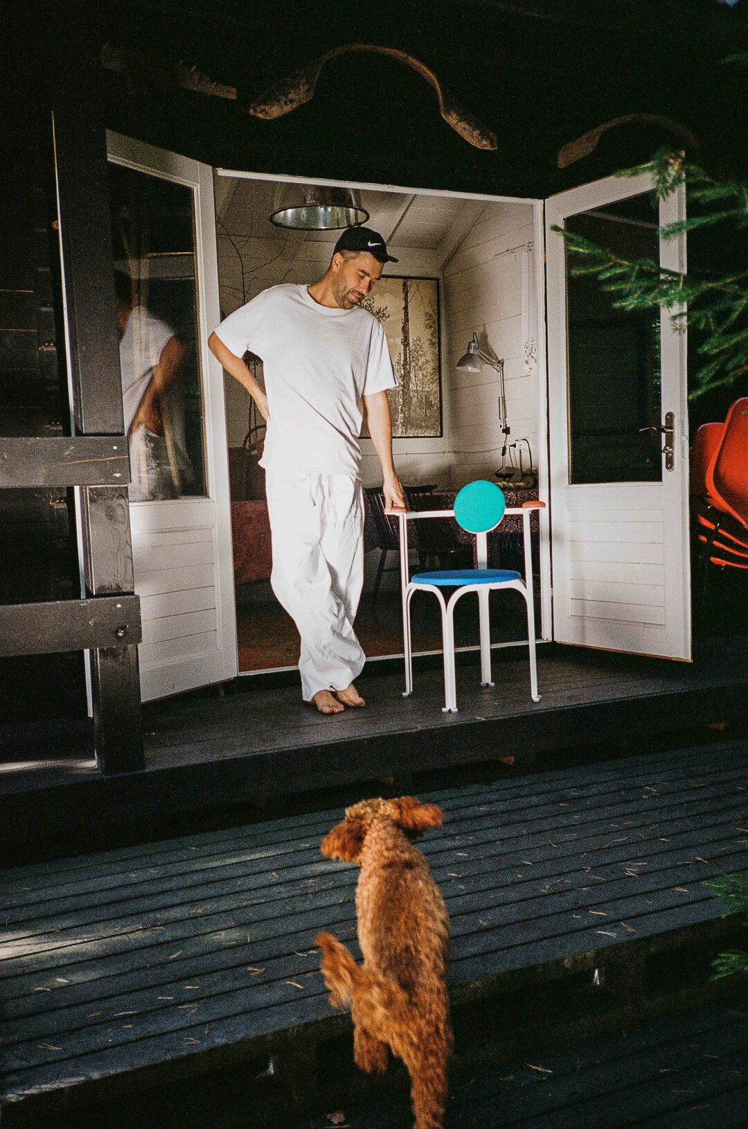 Архитектор Александр Каныгин в брюках M_U_R из первой коллекции бренда со стулом Circus chair своей работы в мастерской