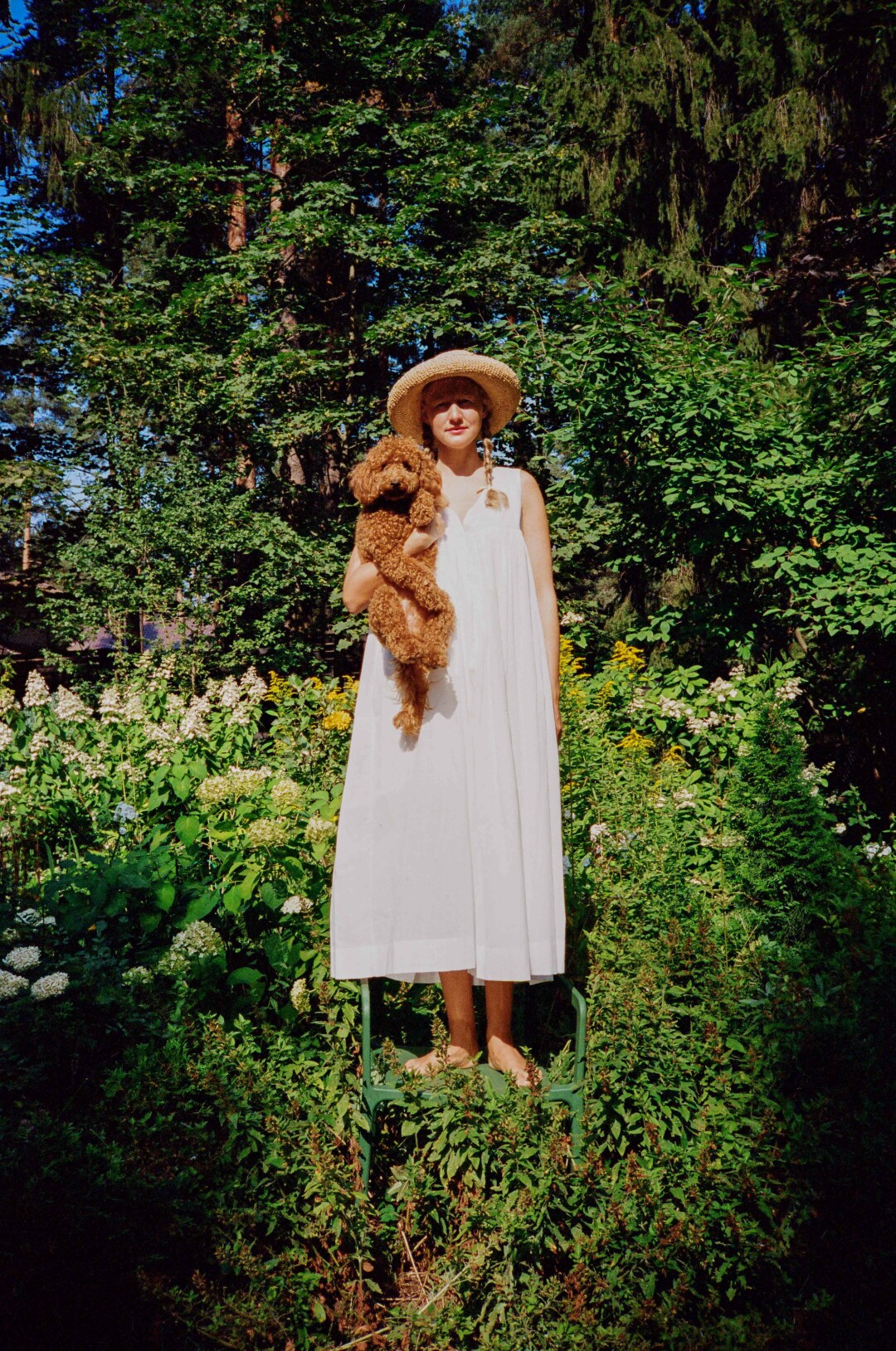 Дизайнер Аня Дружинина в ночной сорочке Rose Nude с малым пуделем Бусинкой в саду своей дачи среди гортензий, золотых шаров и спиреи