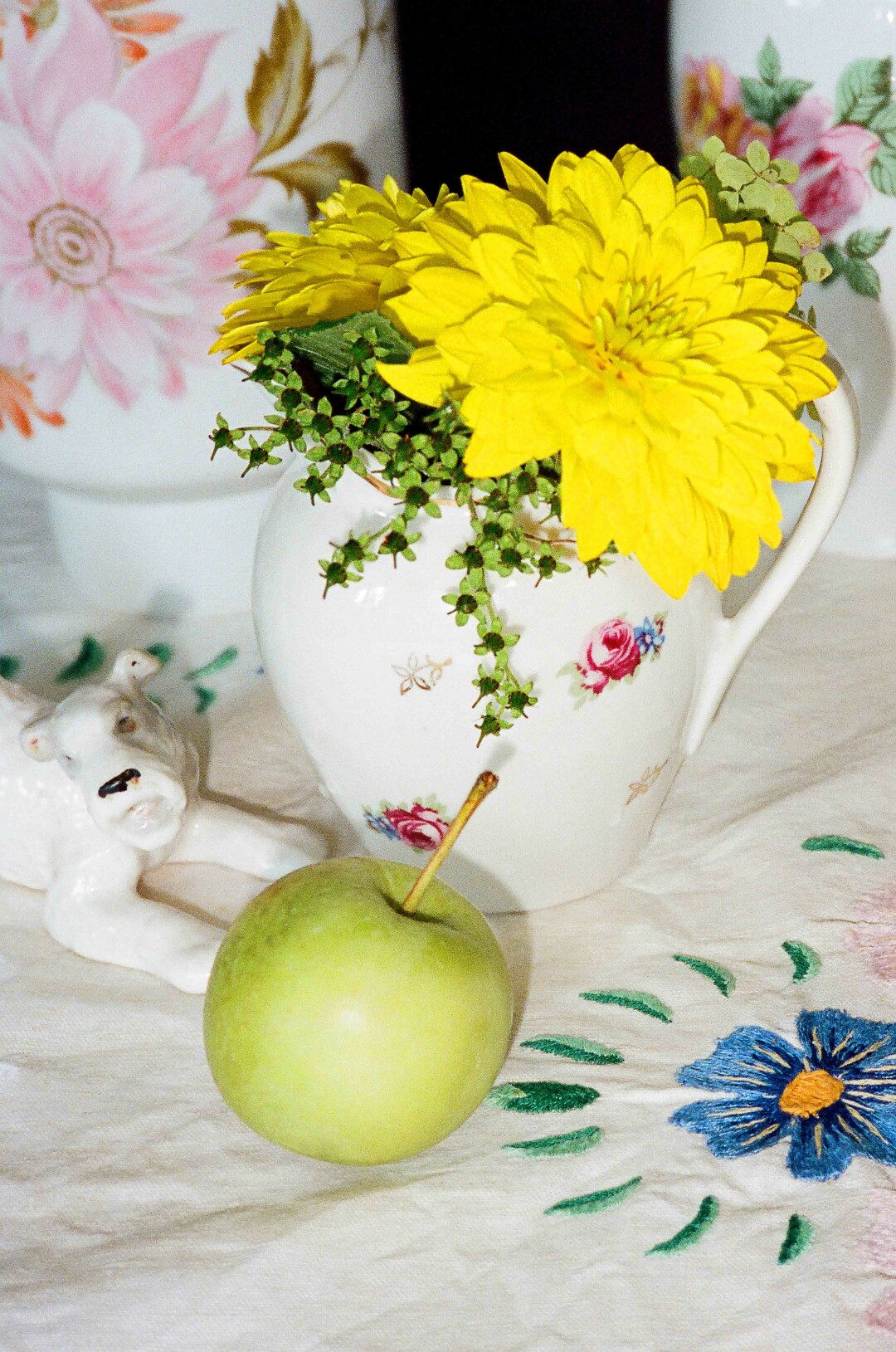 Скатерть — с винтажного рынка на Удельной, посуда — советский винтаж, яблоко и цветы — из сада