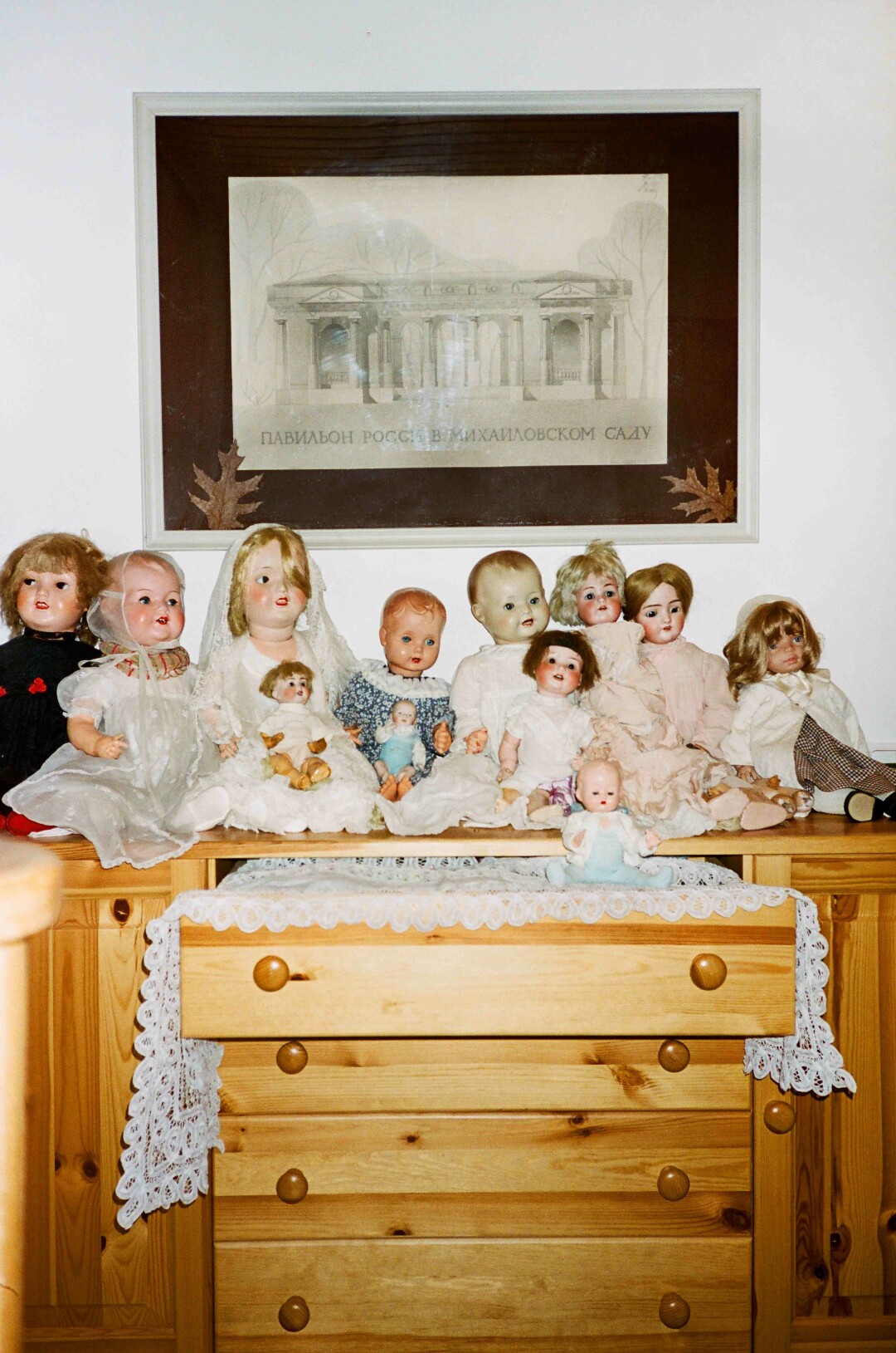 В коллекции кукол есть экземпляры со всего мира, над ними — отмывка павильона Росси, которую Аня сделала на первом курсе ГАСУ