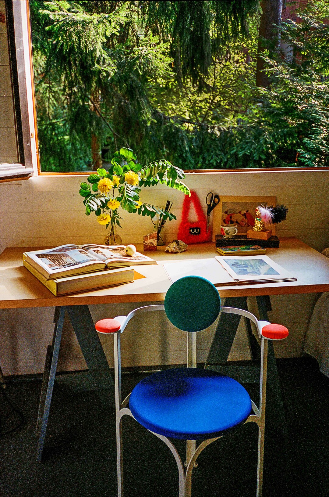 В мастерской Ани альбомы по искусству и стул Circus chair дизайна и работы ее мужа, Александра Каныгина