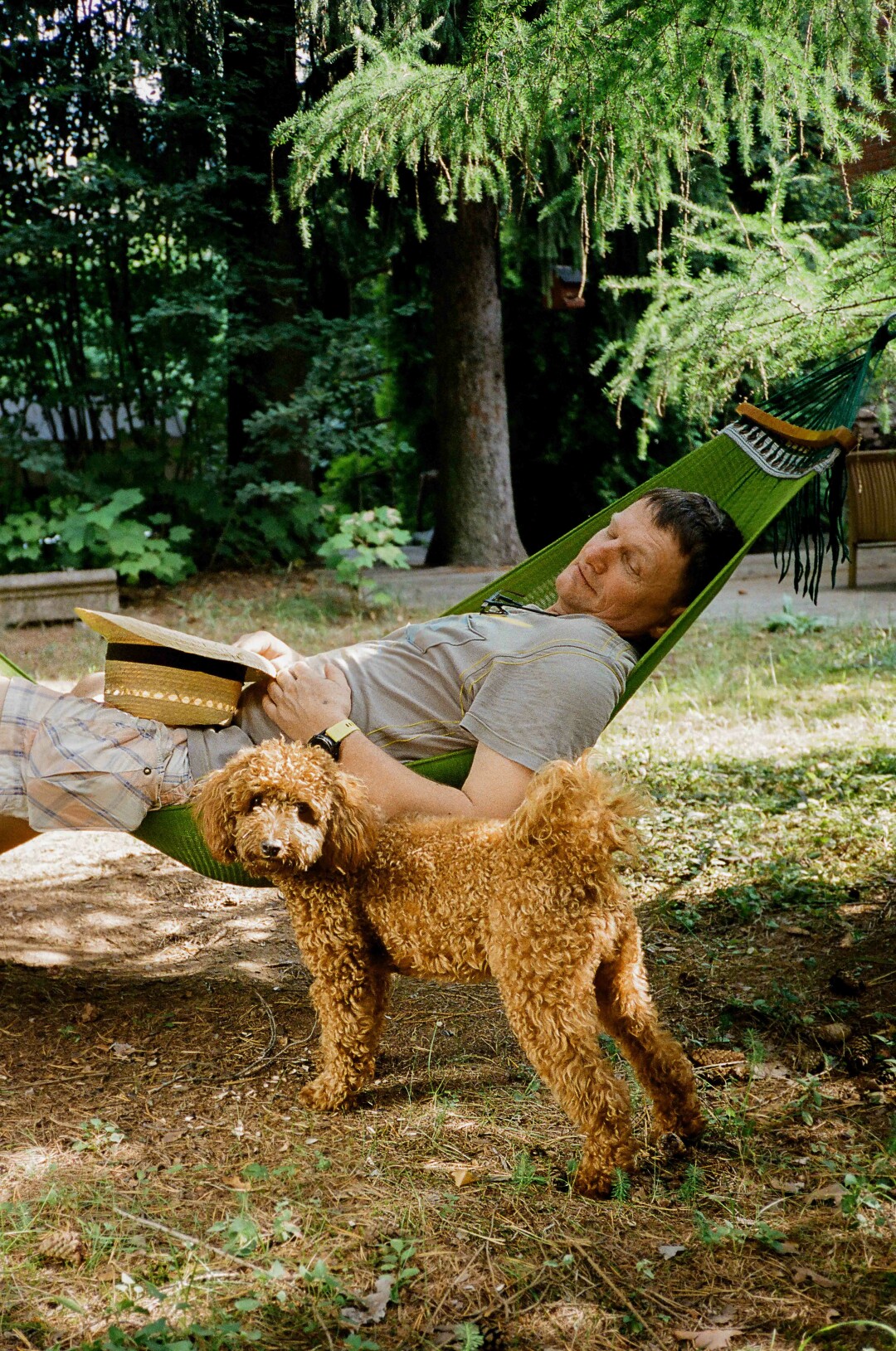 Отец Ани Андрей отдыхает в гамаке под присмотром малого пуделя Бусинки (да, вот так называется эта порода!)