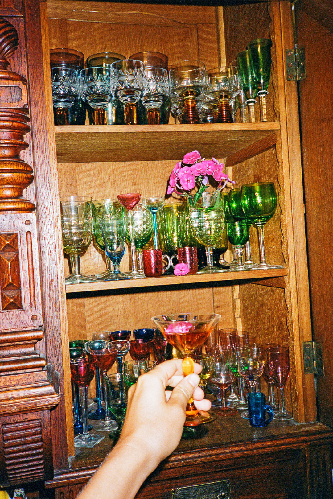 В резном дубовом буфете в гостиной хранится коллекция цветного хрусталя и стекла