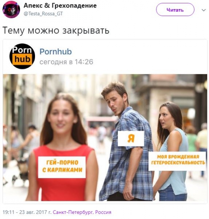 Совершенно обычная фотография из Shutterstock под названием «Неверный парень» (Disloyal man) превратилась в августе в мем «Я и мои слабости», который с большим удовольствием постят пользователи со всего мира. Неверный парень со стокового снимка оказался идеальным олицетворением борьбы с соблазнами, которые имеются у каждого. Некоторые компании даже использовали вирусное фото в своей рекламе, но иногда не очень удачно: так, на минувшей неделе пользователи Facebook обрушились на SMM-отдел «Альфа-Банка», использовавший мем, с обвинениями в сексизме. Создатель фотографии, а по сути, «отец» мема — испанский фотограф Антонио Гийем рассказал о том, что он думает по поводу внезапно свалившейся на него славы.