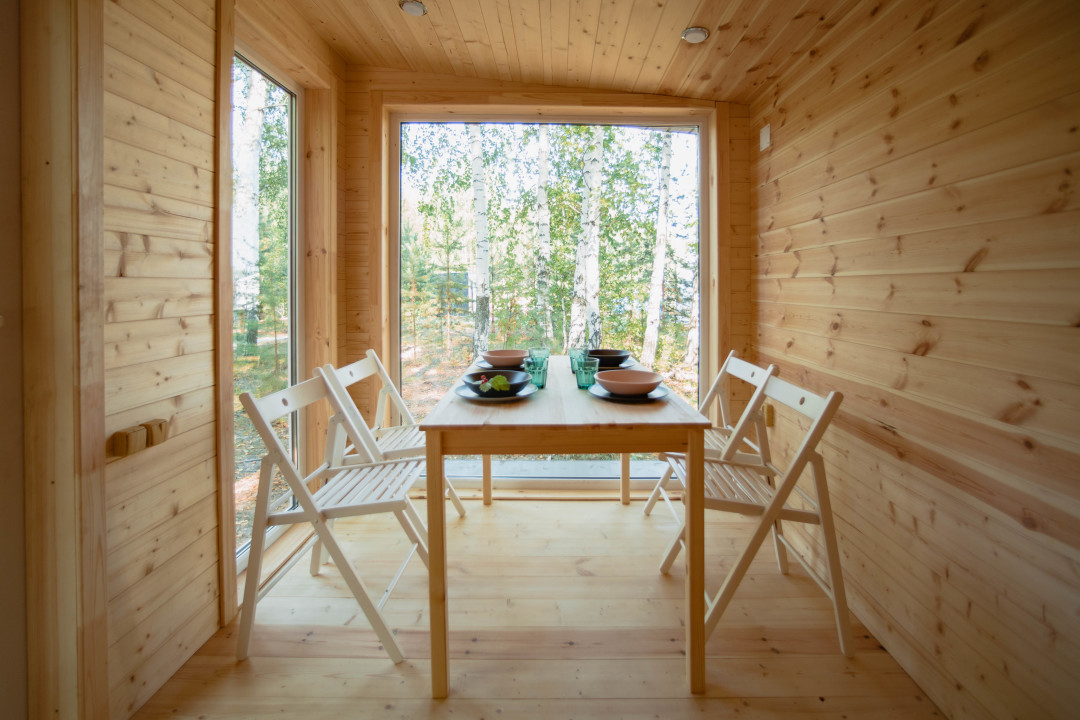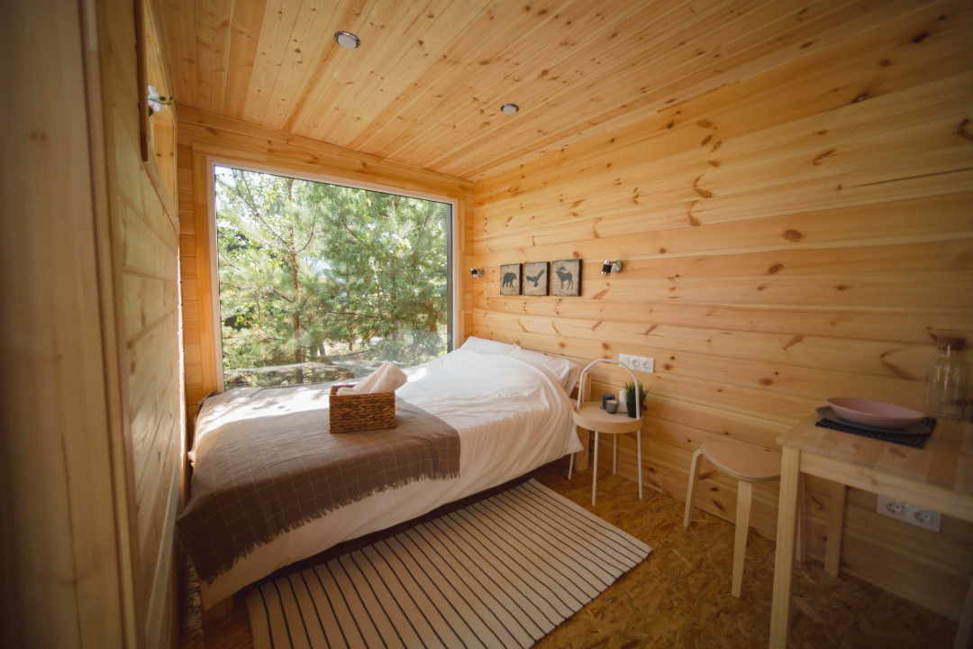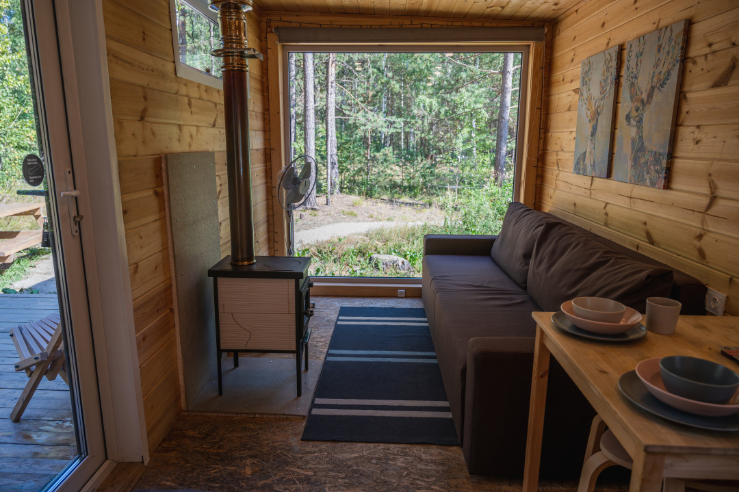 Всего на территории восемь уютных домиков: шесть двухместных и два четырехместных. В каждом из них есть кухонные принадлежности, холодильник и газовая плита. Любоваться видом можно из панорамного окна прямо не вставая с двуспальной кровати. В домиках оборудованы электрические отопители, а в некоторых для тепла и атмосферы можно зажечь камин. Интерьеры выдержаны в скандинавском стиле: для отделки использовали приятные глазу натуральные материалы природных оттенков, а в дизайне отдано абсолютное предпочтение простоте, функциональности и уюту.