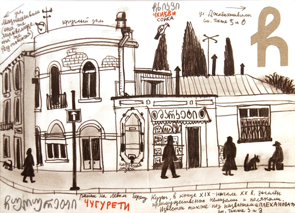 Сувенир, который я рекомендую на память о Грузии всем своим друзьям — «Тбилисская азбука» Александра Флоренского. Это такой авторский путеводитель по городу, а попутно учебник, по которому можно постепенно запомнить грузинский алфавит. Каждой букве соответствует картинка — район города (Авлабар, Дидубе, Марджанишвили, Ортачала), исторический памятник или здание (Нарикала, Сиони, Карвасла) и просто самые будничные явления и вещи (Такси, Макдональдс, Вино). Купить ее можно, например, в Литературном кафе на Шардене.