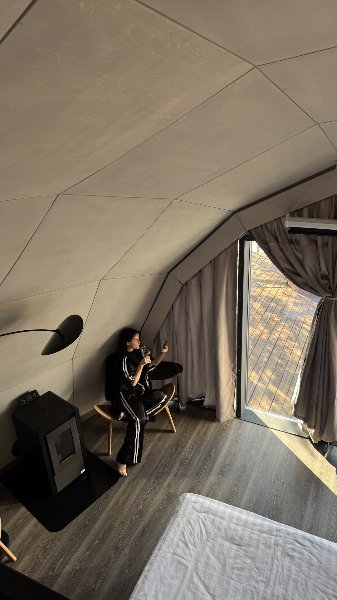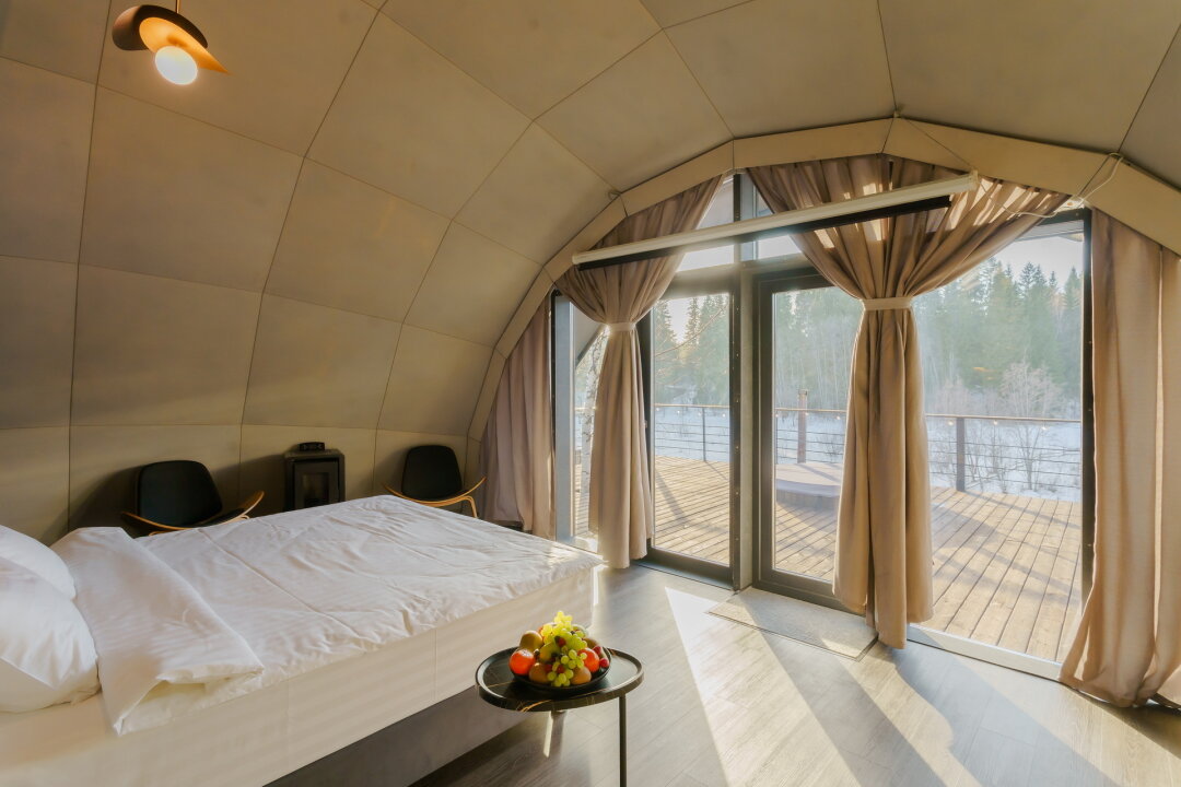 Пять домиков с панорамными окнами (звездное небо прилагается!) гармонично вписаны в лесной пейзаж. Внутри — минималистичный интерьер в нейтральных тонах, натуральные материалы и ничего лишнего. Утром вы просыпаетесь под пение птиц, что, пожалуй, лучше любого плейлиста, днем наблюдаете за игрой света сквозь кроны деревьев, а вечером начинается настоящая магия!