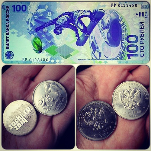 Сегодня Центробанк России выпустил в обращение 100-рублевые олимпийские купюры. На одной их стороне изображен сноубордист, летящий над Сочи, а на другой — главный стадион игр «Фишт» и жар-птица. Тираж составляет 20 млн экземпляров: часть из них будет реализована в качестве сувениров, а остаток выпустят в свободное обращение, так что, теоретически, обладателем памятной банкноты может стать каждый.