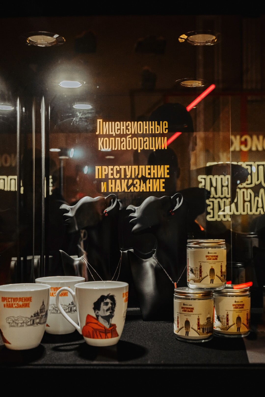 В фойе первого этажа были представлены мерчем из лицензионных коллекций по сериалу «Преступление и наказание»: красная моносерьга в форме капли SBLESKOM, чашка с изображением Раскольникова от «Императорского фарфорового завода» и ароматическая свеча Banka Home.