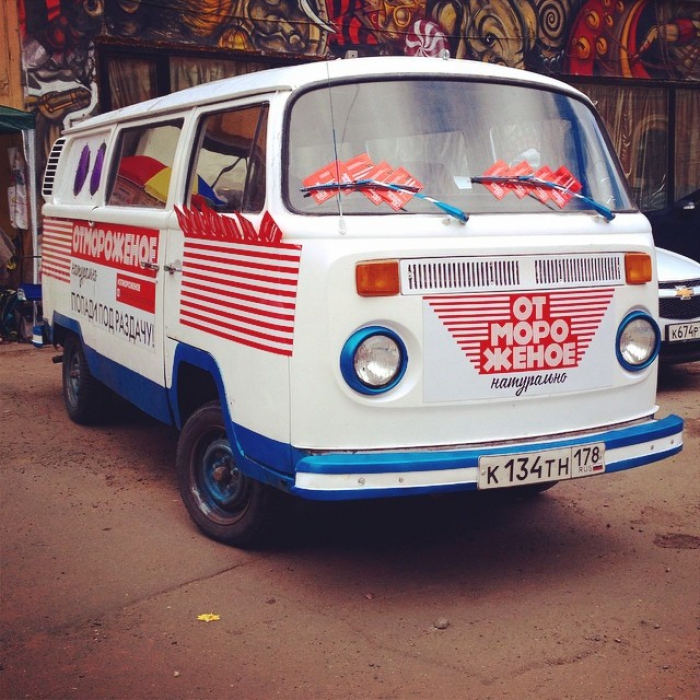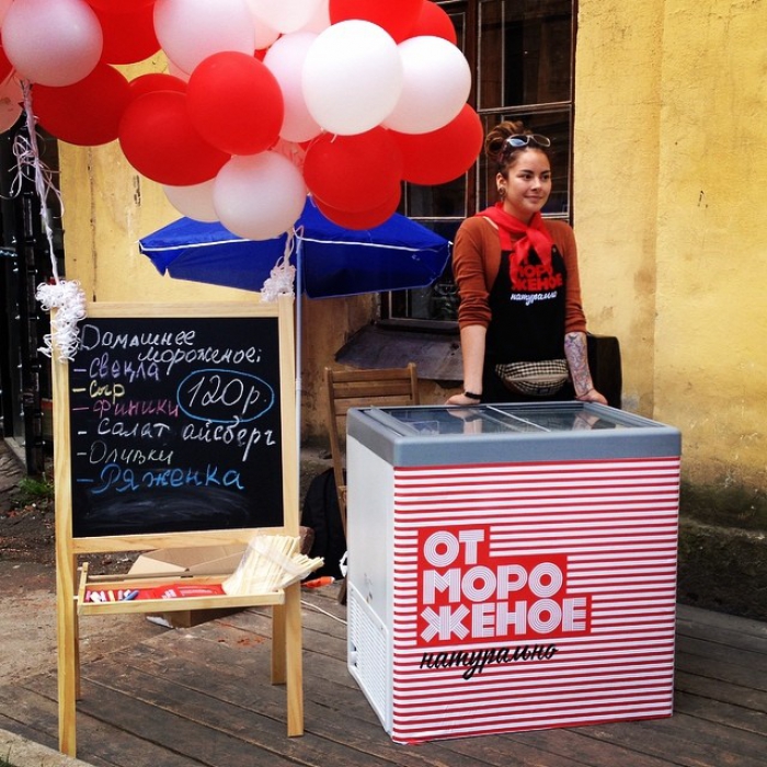 Это сложный технологический процесс, так как состав и консистенция натурального вкусового наполнителя сильно влияет на качество мороженого. Поэтому мы не можем позволить себе использовать покупные ингредиенты и готовим сами: запекаем свеклу, готовим мусс из лосося, измельчаем финики и петрушку, чистим авокадо. И для каждого сорта вырабатываем свой способ соединения пломбира и вкусового ингредиента. Где-то это небольшие кусочки листьев салата, целые ягоды, где-то растертое пюре из авокадо. Для самого трудоемкого «Отмороженного индюка», паштетного мороженое из мяса индюка, мы печем, вялим того самого индюка, на травах и коньяке готовим паштет. С мороженым можно экспериментировать бесконечно, придумывать тот или иной вкус. В конце лета, на Невском, 128, это угол с Суворовским, откроется фирменный ресторан нашего бренда «Отмороженое», своего рода центр разработок экспериментальных вкусов мороженого. Стилистика дизайна интерьера будет отсылать к советскому модернизму 60-80 годов. Концепция — сочетание традиционных блюд советской кухни с необычными сортами крафт-мороженого. Там можно будет попробовать самые смелые сочетания вкусов, даже мороженое из лука.