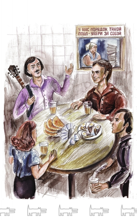 Поступив в театральный институт, я первым делом, конечно, прочесал всю Моховую улицу. Самым важным заведением оказалась рюмочная, где продавалась очень дешевая закуска: кильки с кусочками яйца, колбаска, сыр, водка по 50 или 100 грамм, ну и пиво за 22 копейки. Впрочем, у нас всегда было все с собой — либо водка, либо вино. Наливали, естественно, под столом. Чебуречные и шашлычные — вот места, в которые заходили все студенты. Чебуреки и шашлыки стоили гроши, чуть дороже обходились чанахи и харчо, но первые блюда никогда не пользовались у нас особым успехом. Знаменитая чебуречная находилась на проспекте Майорова, ныне Вознесенском, она, кстати, до сих пор существует. И самое главное — пирожковые! Одна была на углу Белинского и Литейного, другая располагалась непосредственно на Белинского, и можно было ходить из одной в другую в зависимости от того, где какая очередь. А очередь была всегда. Там предлагались пирожки с творогом, с тушеной капустой, с повидлом, но ваш покорный слуга предпочитал пирожки с мясом — съел их за четыре года учебы, наверное, несколько вагонов. Ну и кофе с молоком из бака, в который его наливали прямо из металлического ведра, — эта сцена всегда приводила в ступор иностранных туристов. Три пирожка по 11 копеек каждый и чашка кофе за 10 копеек — получалось недорого. На то, что оставалось от рубля, можно было купить бутылку вина, если с кем-то скинуться. В большинстве этих заведений все было очень убого: ширпотребные стулья, вечно качающиеся столы, слипшаяся соль и пустая горчичница, грязные скатерти.