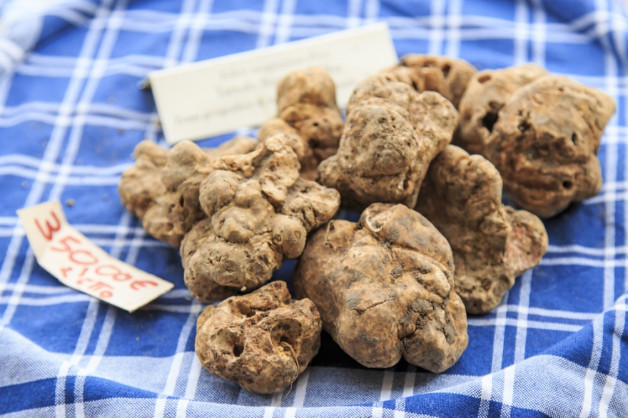 Существует много разновидностей трюфелей, но самыми редким являются грибы белого цвета из регионов Умбрии и Пьемонта. Они имеют коричневую кожуру, светлую мякоть с красными прожилками и более выраженный аромат, чем у черных трюфелей. Высокая цена зависит от их размера, специфики сбора и условий, в которых они растут. Так же, грибы, собранные в неурожайный сезон всегда будут намного дороже и ценней.