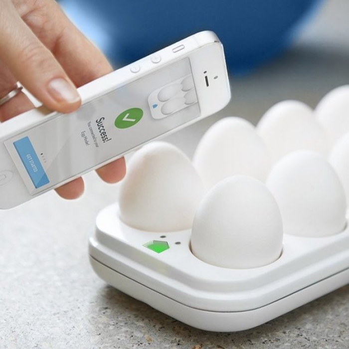 Гаджет в виде лотка для яиц ведет учет срока годности и присылает push-уведомления на телефон, когда их нужно срочно употребить в пищу, либо выбросить. Он так же поможет разобраться в яичной путанице и укажет на самое старое яйцо. Лоток подключается к телефону с помощью Bluetooth и работает через бесплатное приложение .
