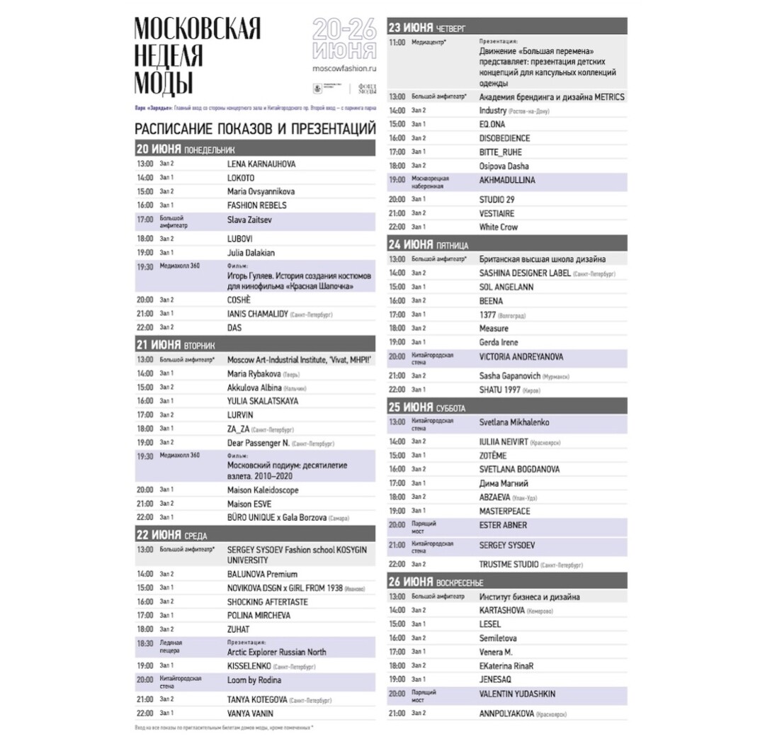 Стало известно расписание показов на Московской неделе моды, которая пройдет с 20 по 26 июня.