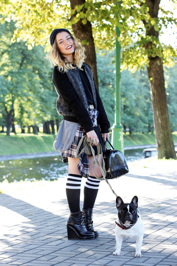 На Жанне: бомбер Pull and Bear, юбка «Твое», шапка H&M, гольфы American Apparel, ботильоны Marc Jacobs, сумка Furla, кольцо и пояс Topshop