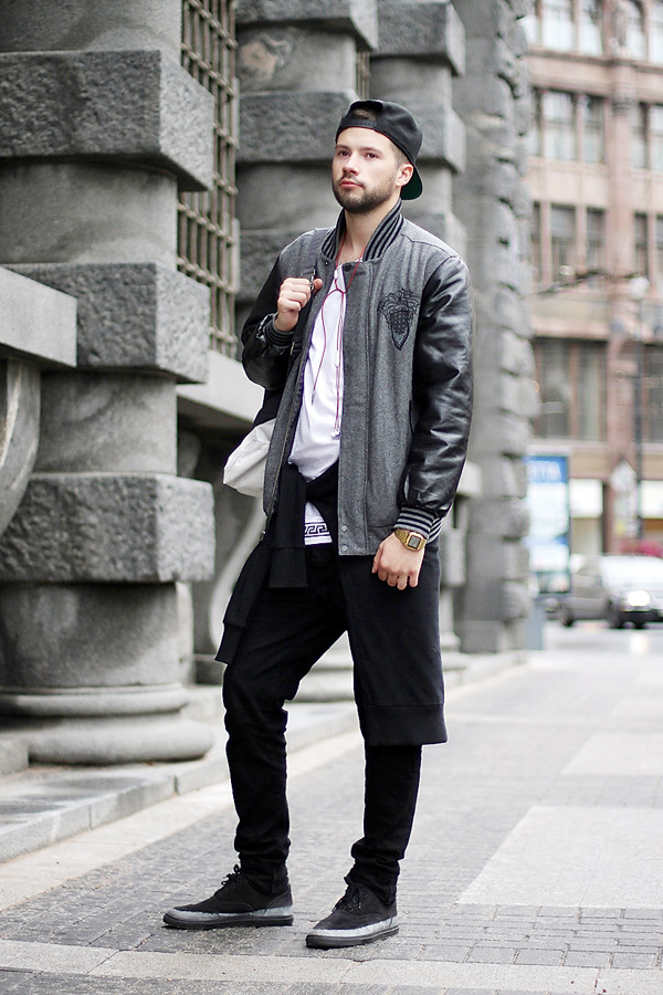На Александре: футболка — селф-мейд, куртка Crooks & Castles, ботинки Marc Jacobs, часы Casio Retro, рюкзак Eastpak by Kris van Assche