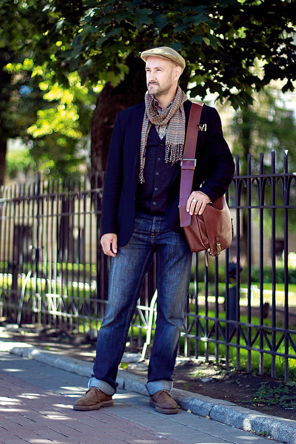 На Николае: пиджак Zara, кардиган H&M, джинсы Hugo Boss, кепка Borsalino, ботинки Fernando Strappa, ремень и сумка Fomitchoff, очки G. F. Ferre, часы Certina