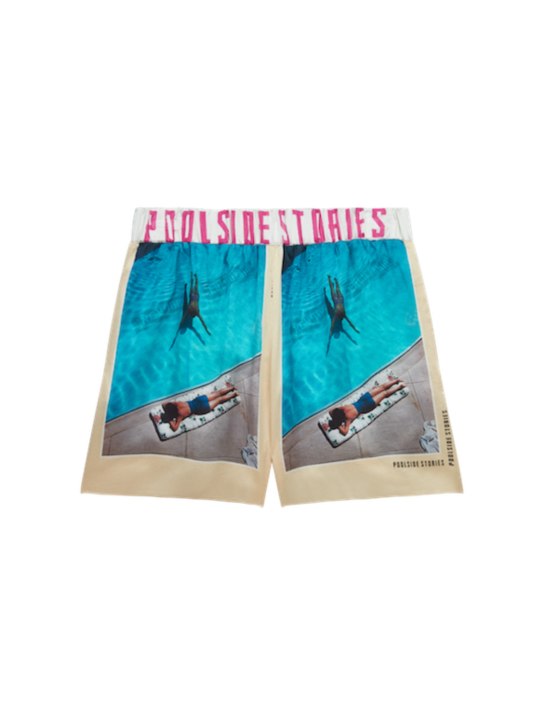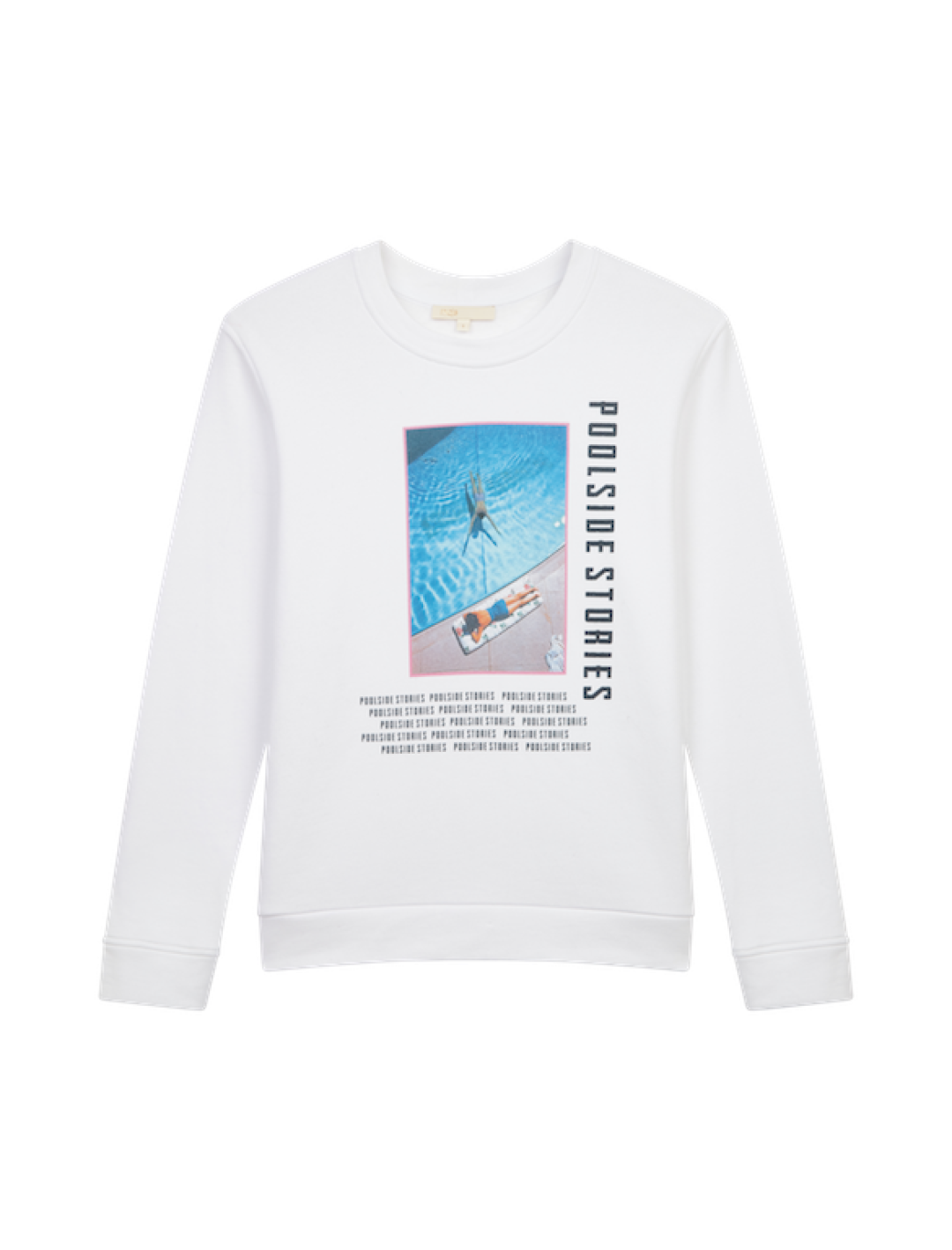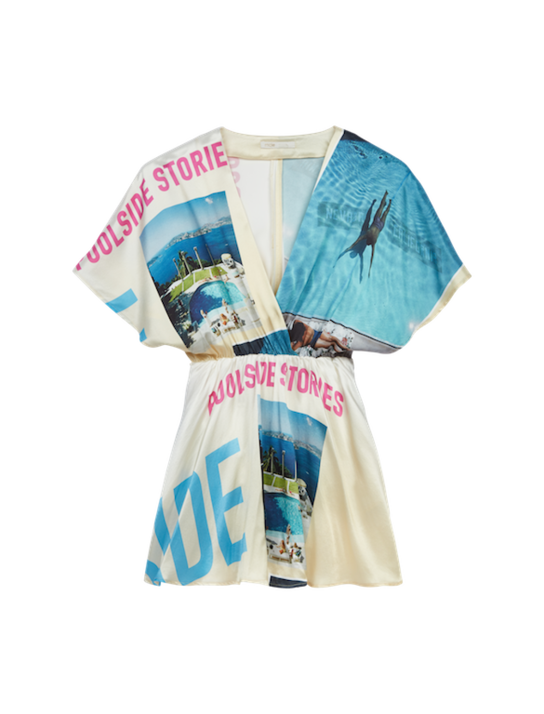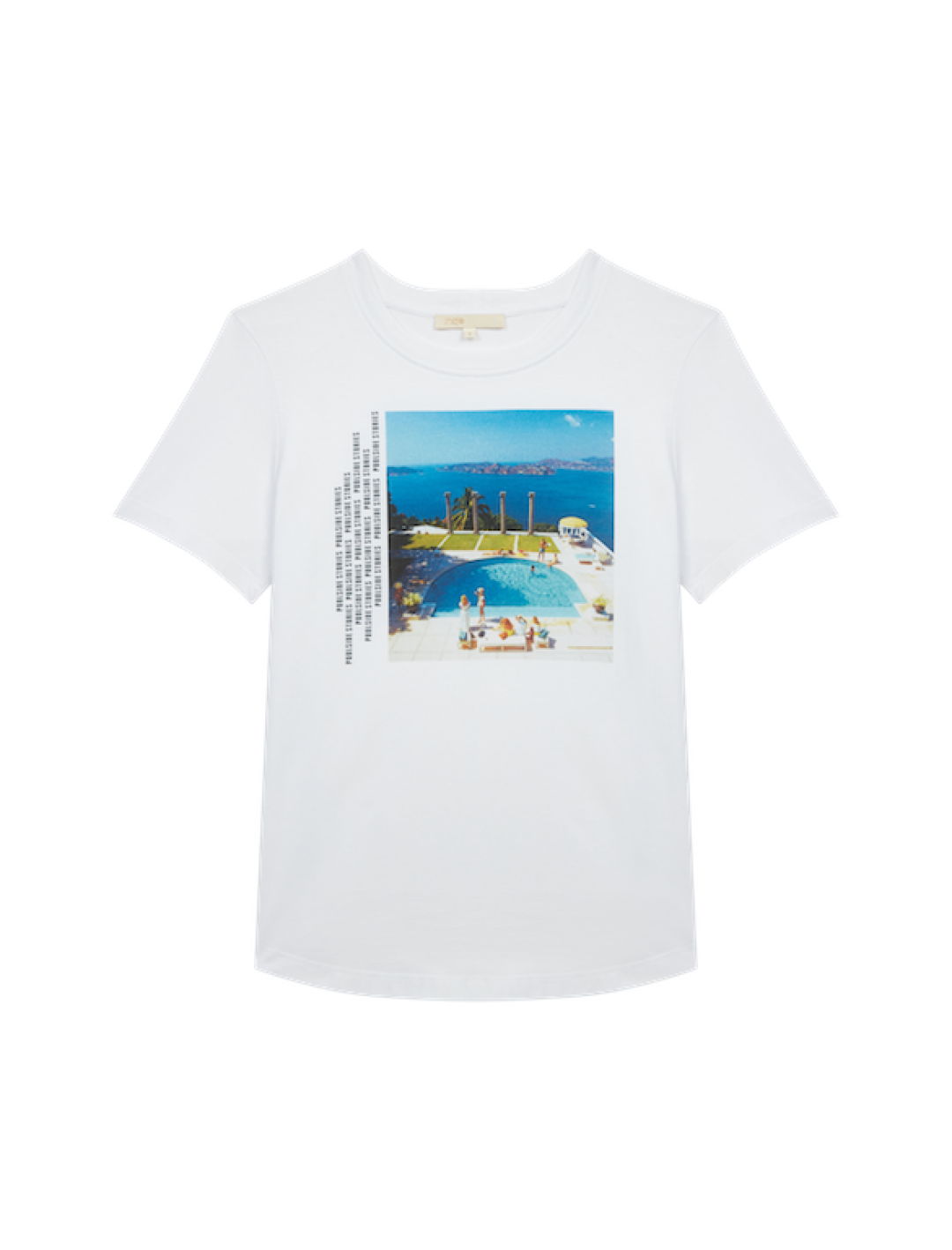 И правда, карточки у Ааронса выглядят как мечта любого инфлюенсера и бренд лишь подыгрывает этой эстетике. Гламурные локации, в которые пока не попасть из-за закрытых границ, Maje печает на белоснежных оверсайз-рубашках и свитшотах, на летящих платьях с открытой спиной и шортах с надписью «Poolside Stories», созвучной не только главной летней мечте — поскорее нырнуть с жары в прохладный бассейн, но и книге Слима Ааронса, в которой фотограф собрал самые яркие кадры из своих путешествий по главным локациям (и виллам!)  светского общества середины XX века — Италии, Карибов, Мексики, Монако и других стран.