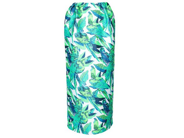 На смену инфантильным ласточкам Miu Miu пришли дикие птицы из джунглей. Вика Газинская, например, жаккардовый комплект из юбки-карандаша и жакета-реглана украсила сине-зелеными попугаями.