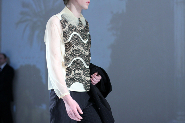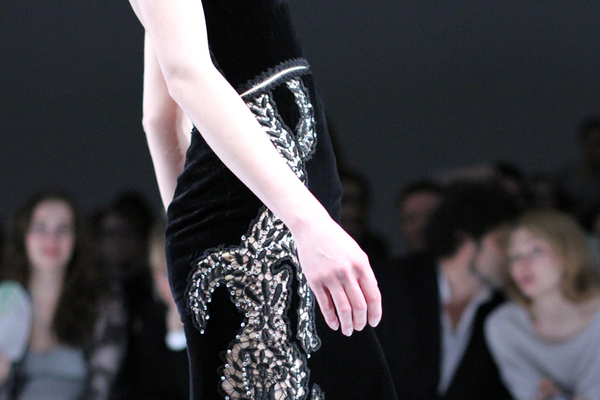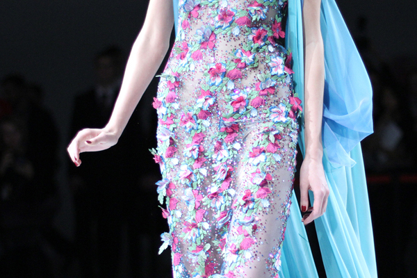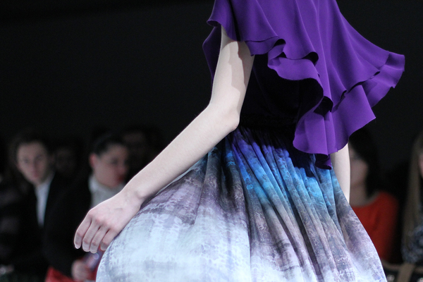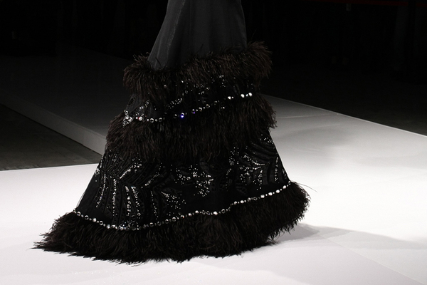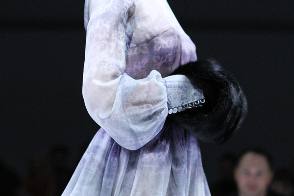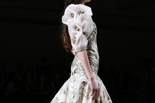 металлизированные ткани, цветочная аппликация, рельефные рукава.