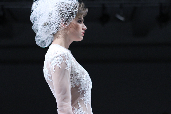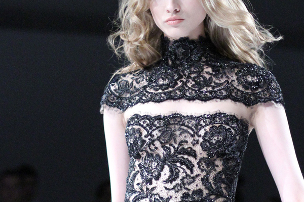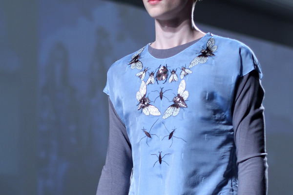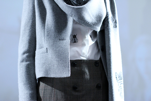 вышивка ручной работы в виде пчел, кружевные ленты и каскады шифона.