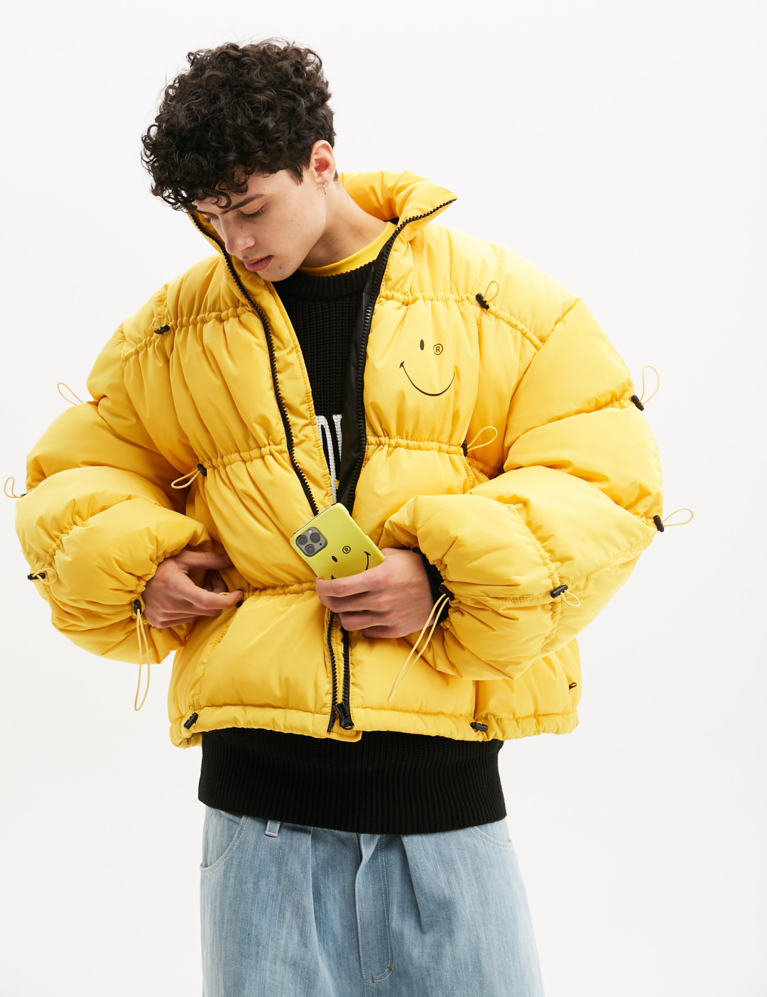Кроме того, в коллекцию вошли оверсайз пуховики с эко-утеплителем, сумки и футболки с принтом в виде смайла из страз. Цветовая палитра включает черный, белый и желтый цвета.
