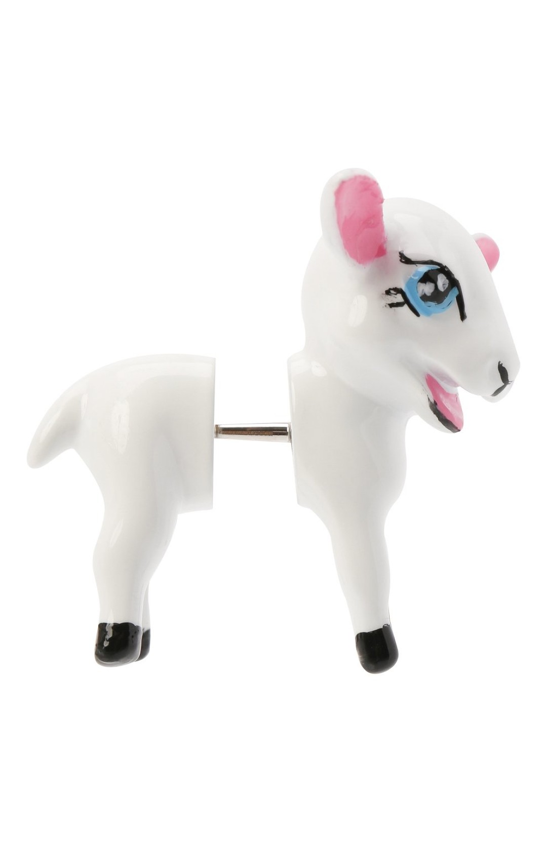 Украшения в форме свинки и овечки выполнены из латуни и алюминия и покрыты эмалью. Несмотря на то, что выглядят они как вполне себе весомые, на самом деле серьги миниатюрные — весом всего 13 грамм. Они вошли в подиумную осенне-зимнюю коллекцию Balenciaga.