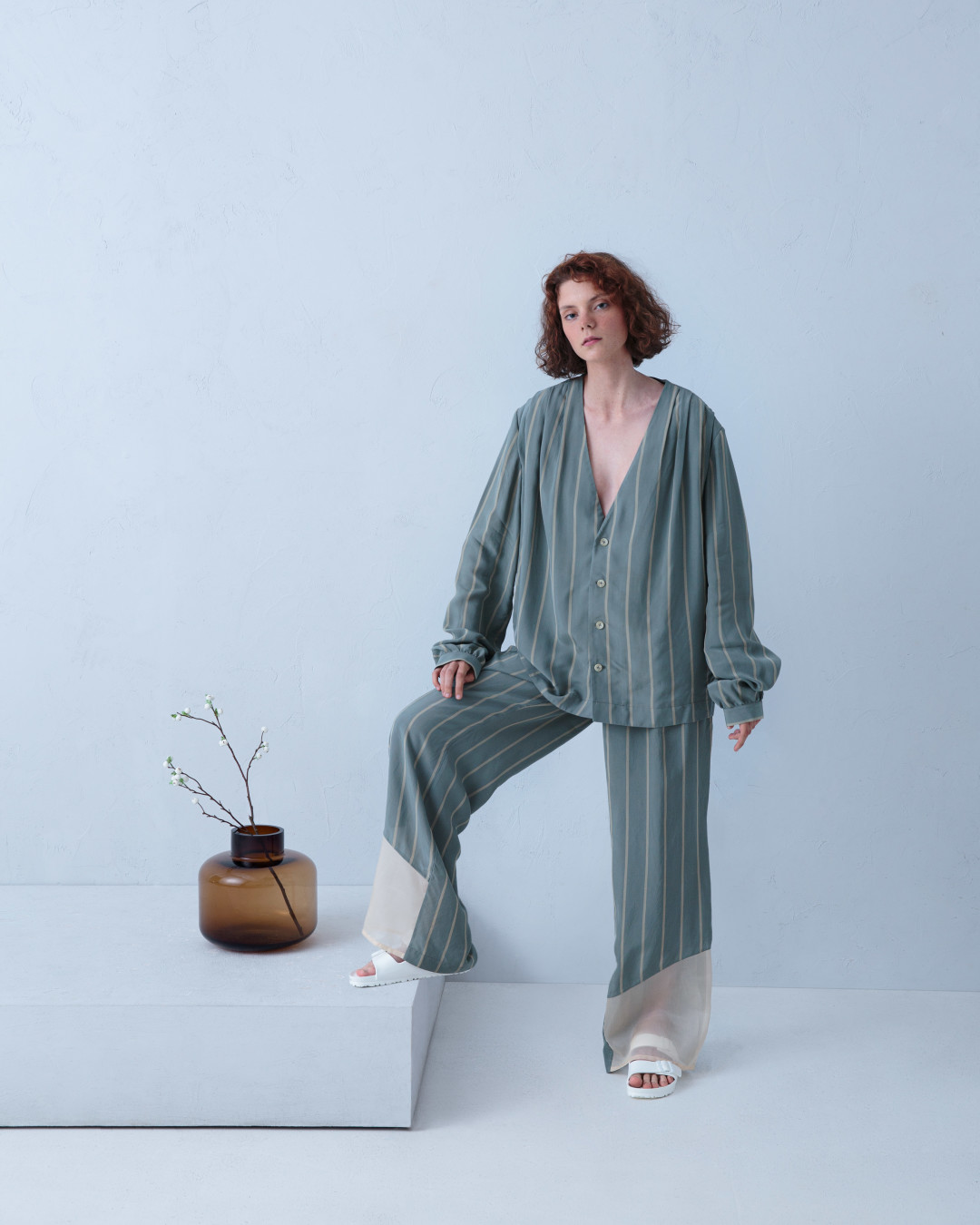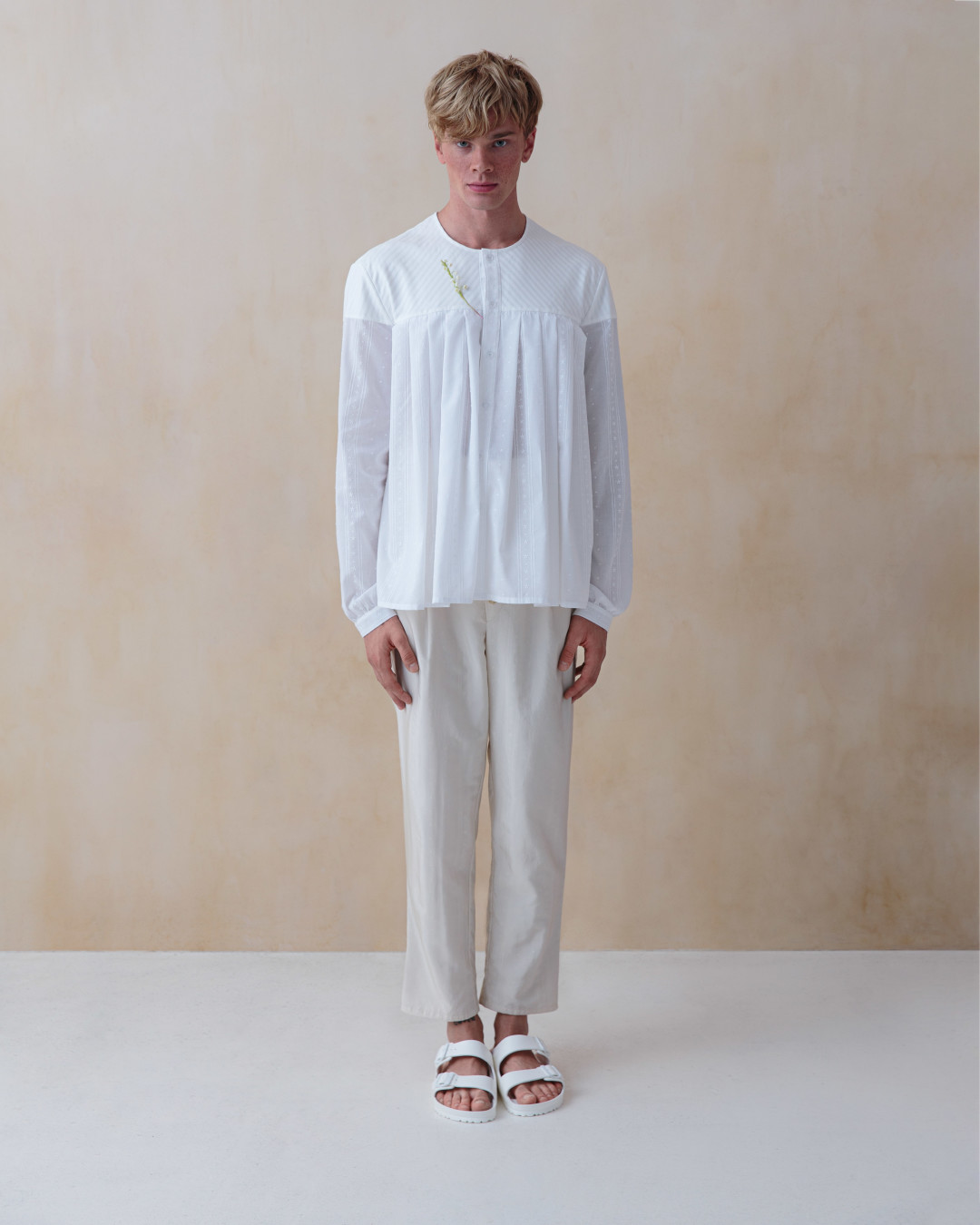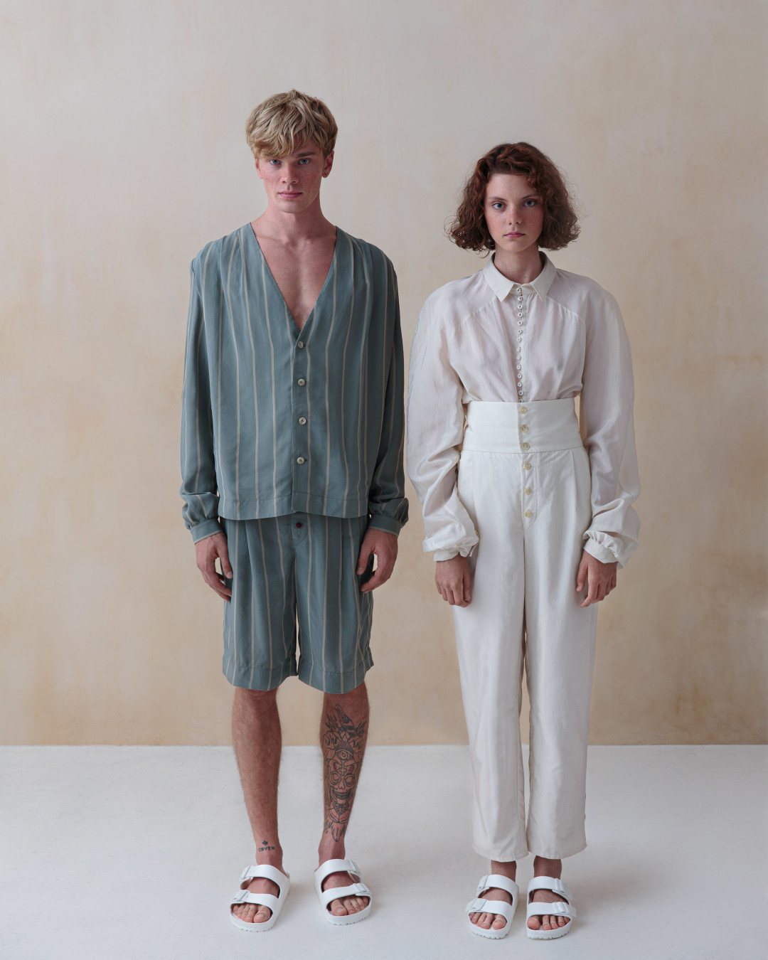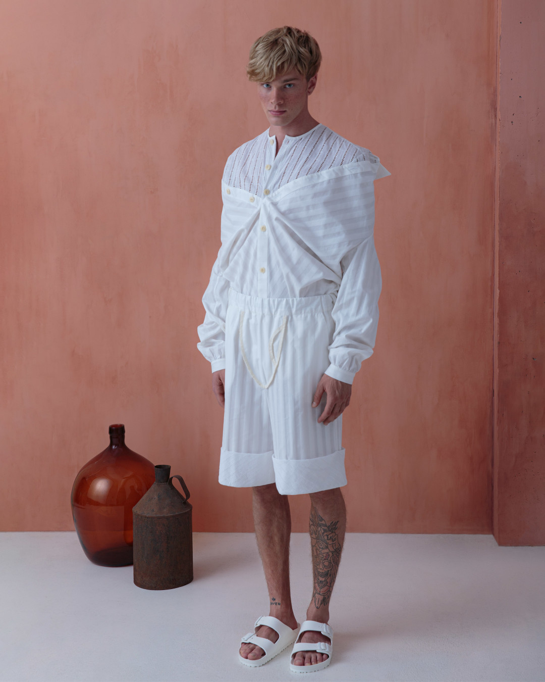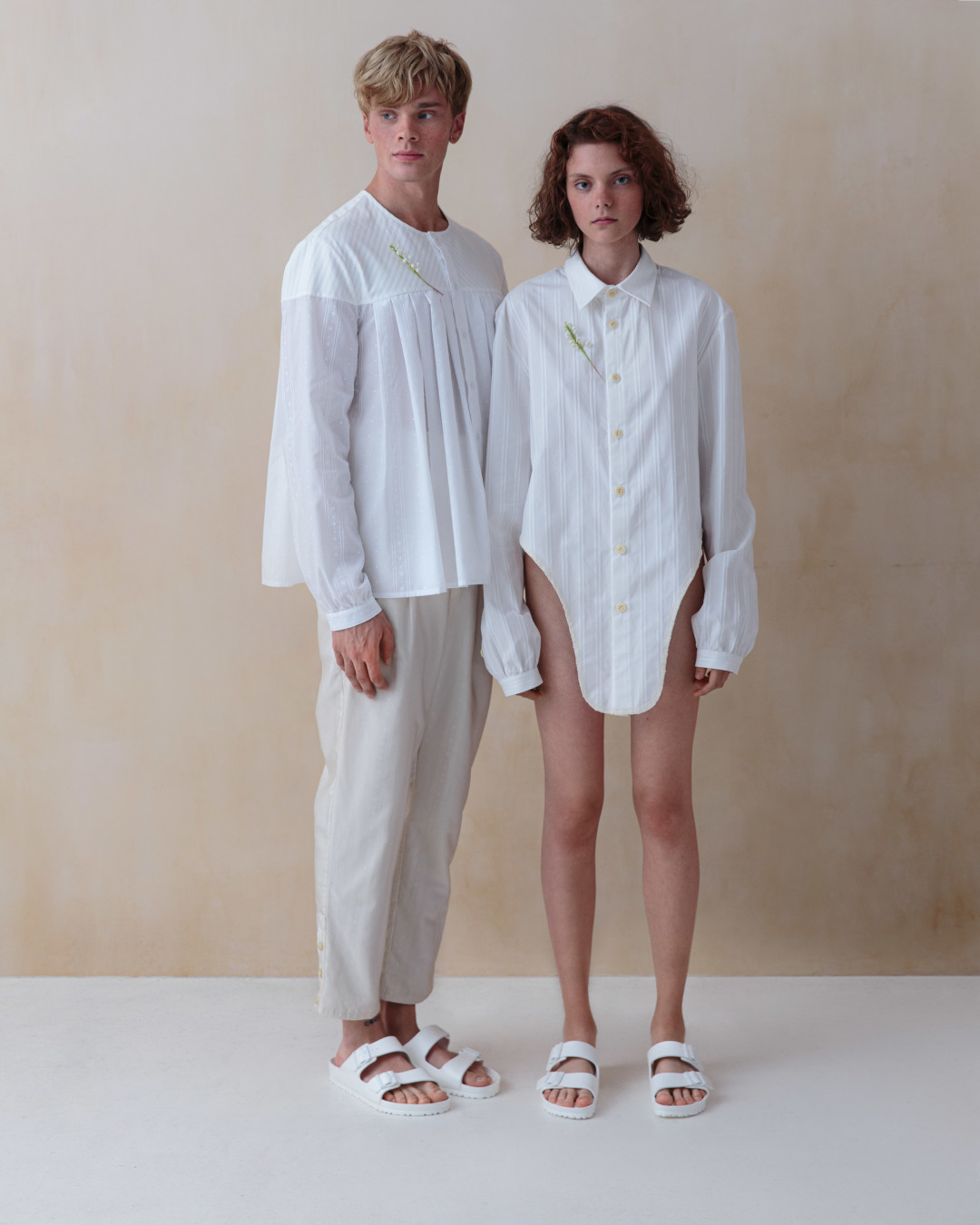 Lil baby of the valley — блузы, брюки, рубахи, бомберы, шорты и оверсайз-пиджаки не имеют маркировки «женское/мужское». Цветовая палитра коллекции вторит посвящению природе, в ней много сложных сочетаний оттенков голубого и зеленого с «театральной» маджентой, а также есть вариации белого и молочного. Привычные для ODOR кружева трансформировались в перфорированные вышитые ткани, похожие по текстуре на вафельные полотенца.