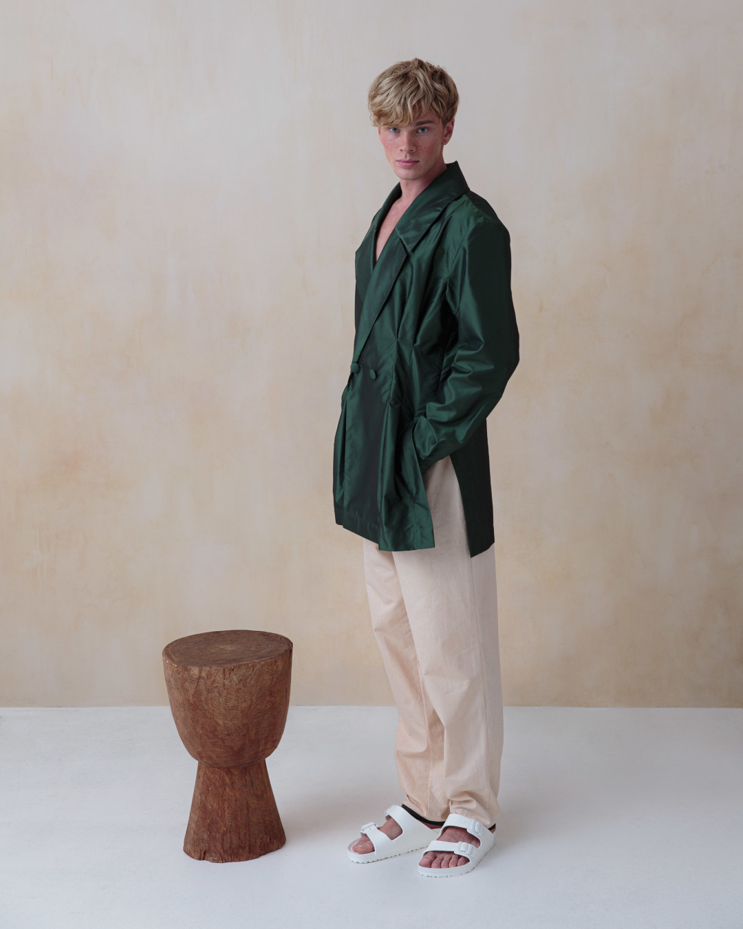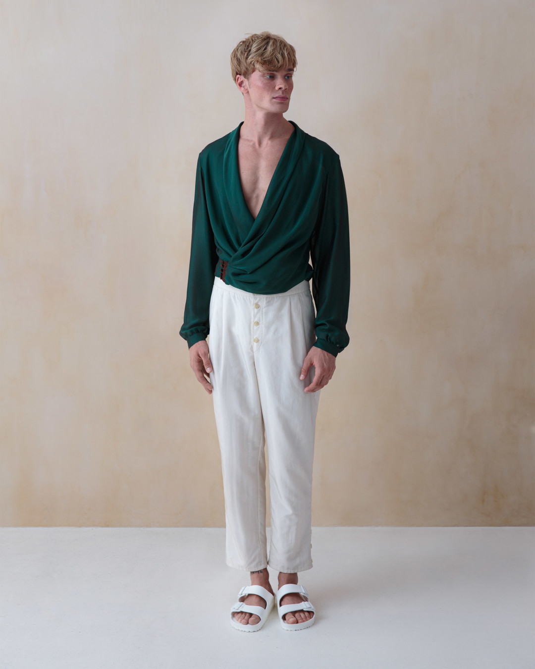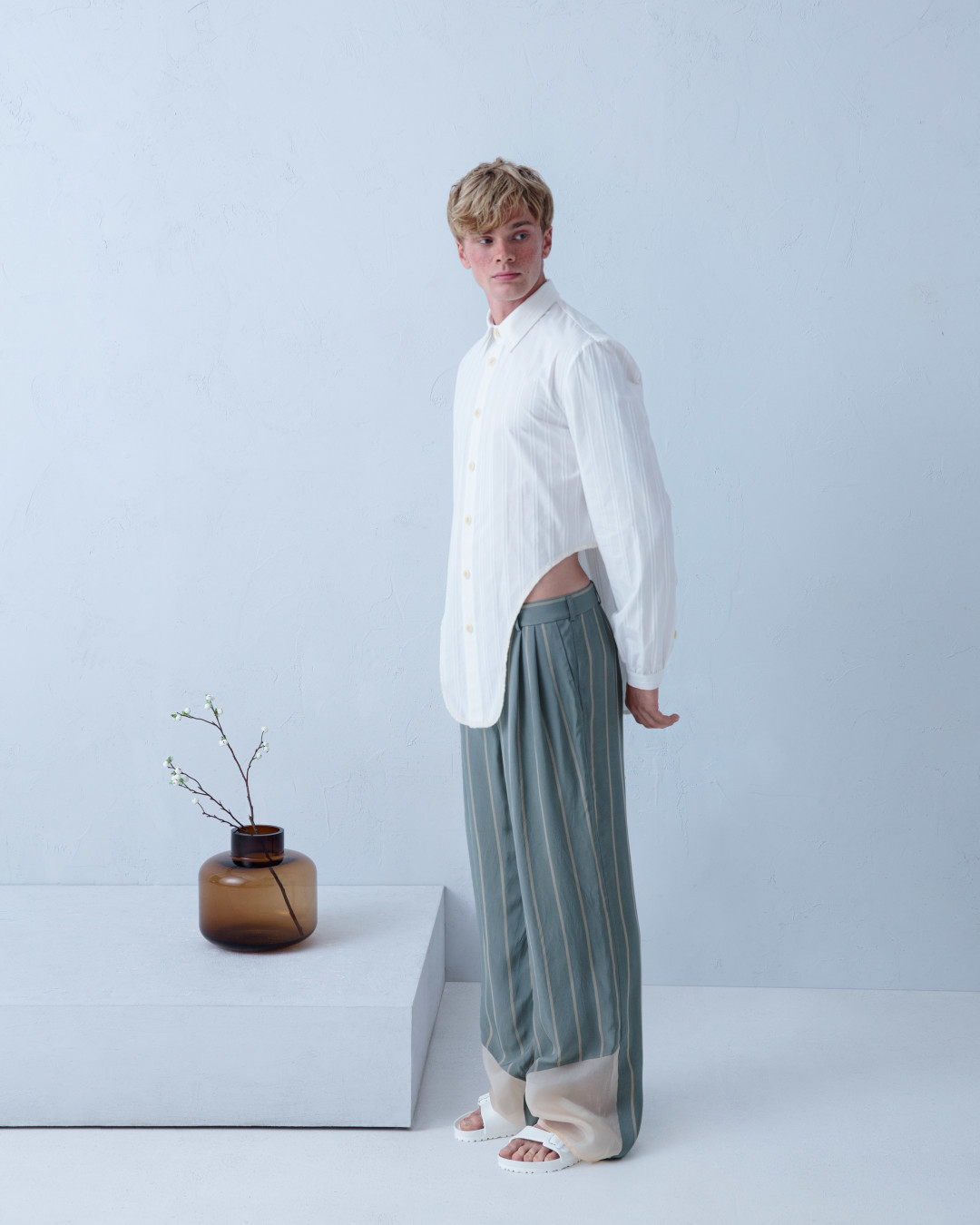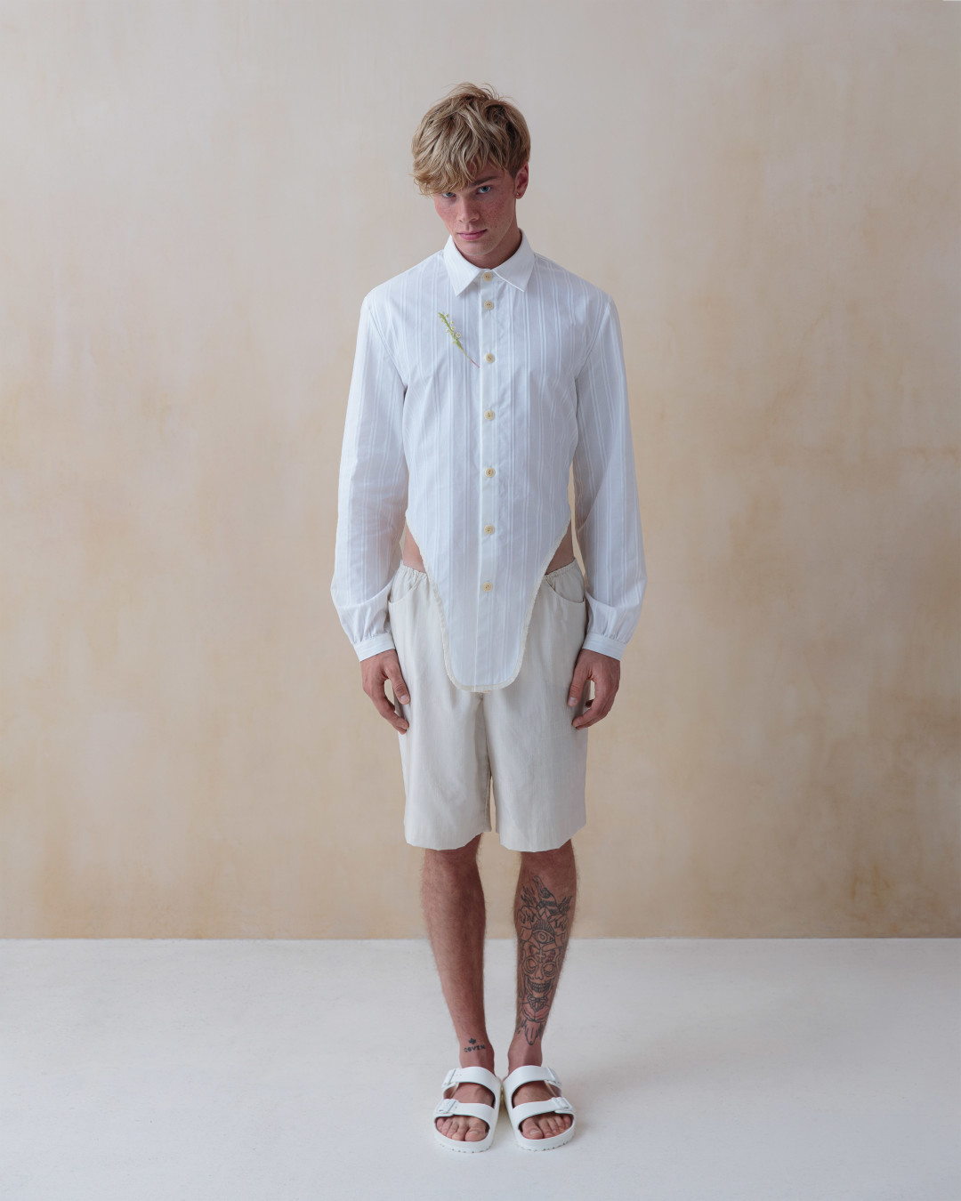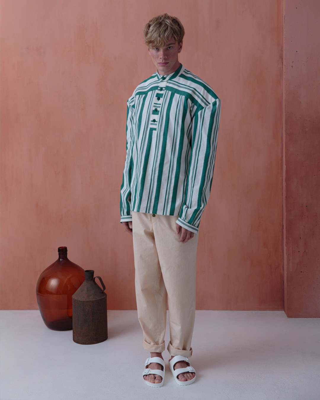 Lil baby of the valley — блузы, брюки, рубахи, бомберы, шорты и оверсайз-пиджаки не имеют маркировки «женское/мужское». Цветовая палитра коллекции вторит посвящению природе, в ней много сложных сочетаний оттенков голубого и зеленого с «театральной» маджентой, а также есть вариации белого и молочного. Привычные для ODOR кружева трансформировались в перфорированные вышитые ткани, похожие по текстуре на вафельные полотенца.