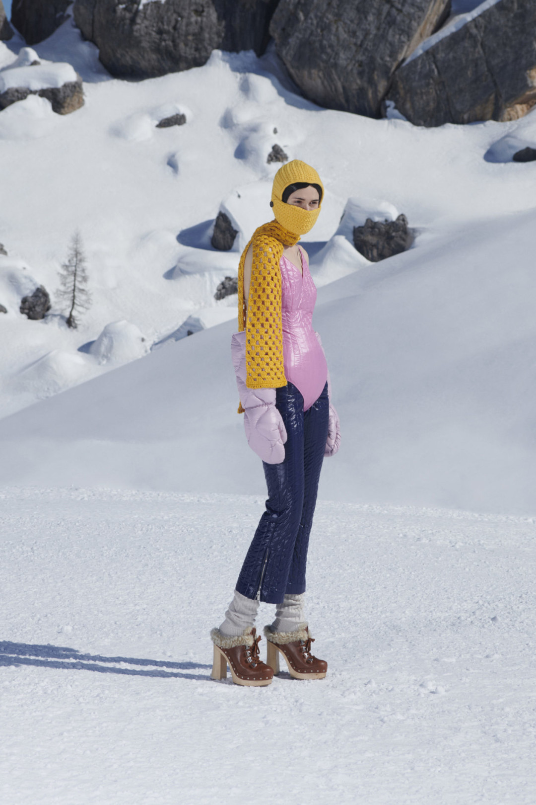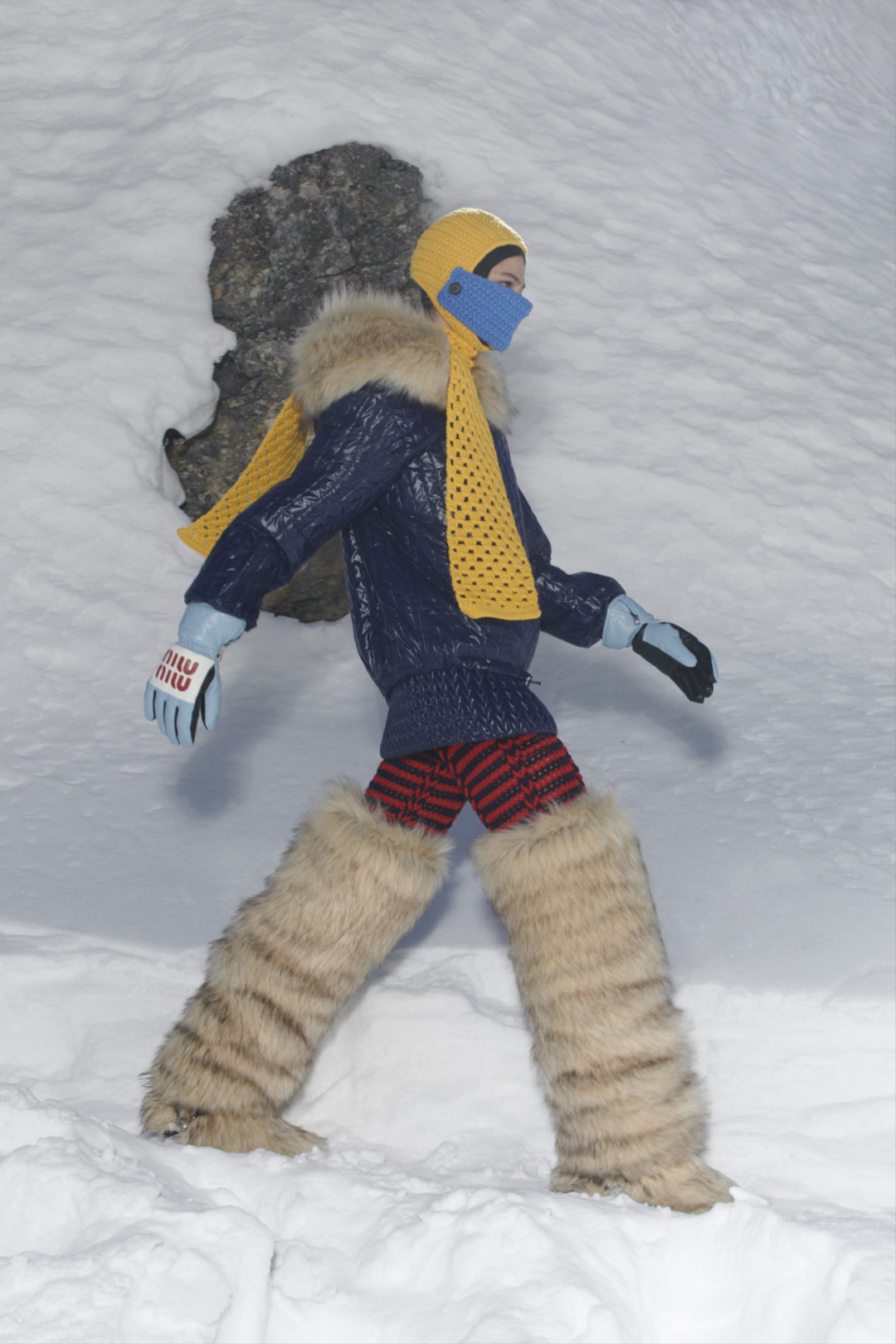 Miu Miu представили коллекцию осень-зима 2021, большая часть которой выдержана в аутдор-эстетике. Креативный директор модного дома Миучча Прада показала объемные пуховки, стеганые лыжные комбинезоны и костюмы, варежки, меховую обувь, напоминающую высокие унты, а также вязаные шапки-шлемы, дополненные масками, которые можно отстегнуть. Также в коллекцию вошли платья-комбинации, надетые поверх вязаных лонгсливов, бра и стеганые юбки. Стилизовала показ Лотта Волкова.