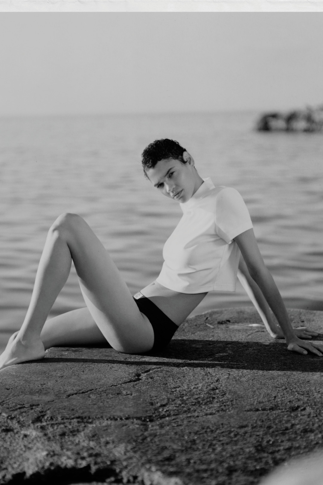 Капсула Calvin Klein Forward Jeans отвечает за эко-устойчивость. Трикотажные модели выполнены из материала, сочетающего органический и переработанный хлопок, полученный из остатков неиспользованных тканей. На джинсах капсулы нет традиционной фурнитуры, а вместо молнии — съемные пуговицы, которые можно убрать при переработке.
