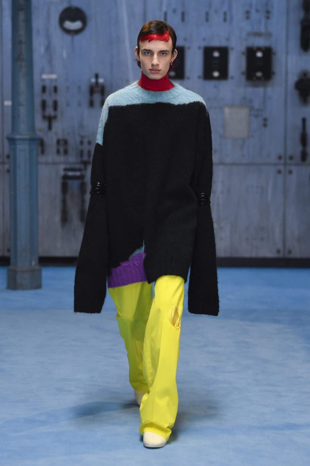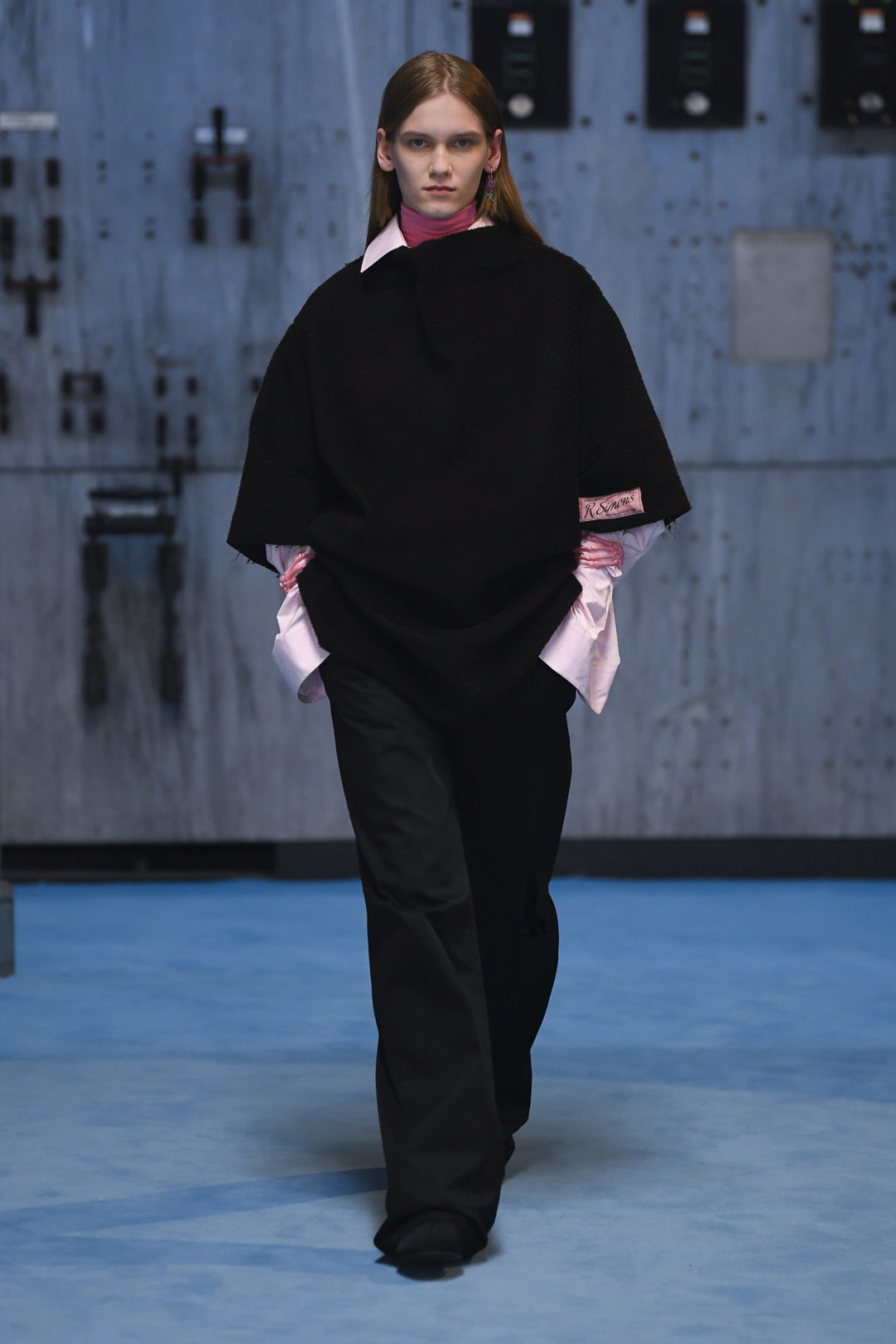 Raf Simons рифмуется с Prada и в стилизации — тому свидетельство закатанные рукава и сумки, которые модели держат в руках. В коллекции собственного бренда Симонса четко продемонстрировано умение дизайнера взаимодействовать с цветом — в палитре розовый, красный, желтый, голубой, зеленый оттенки.