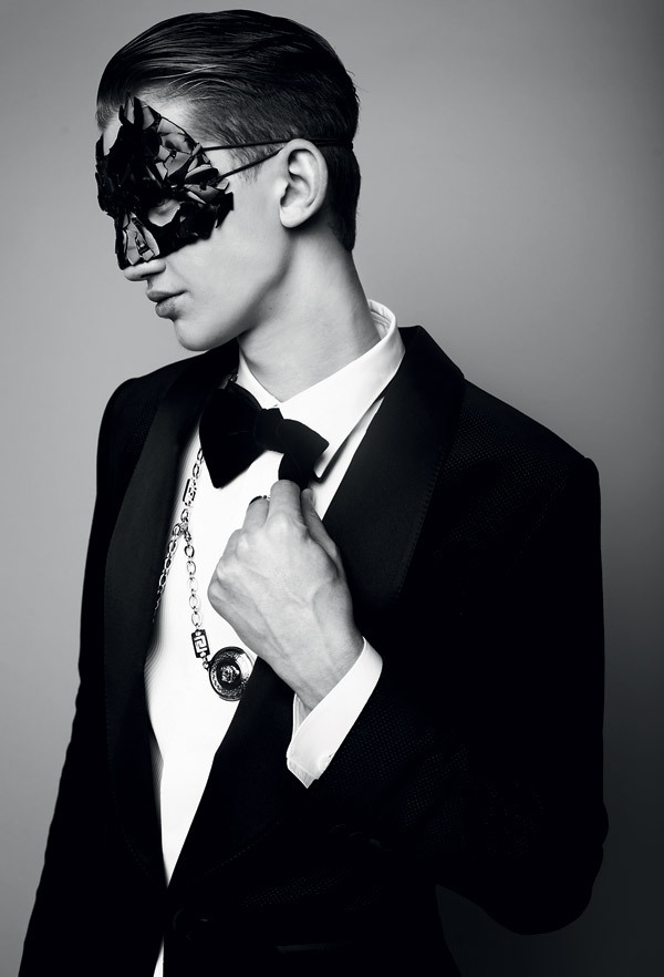 Смокинг и сорочка D&G, маска Agre, бабочка Lanvin, ремень, надетый как колье, — Versace