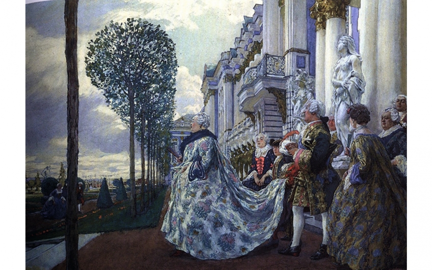 Из гардероба Екатерины II уцелели лишь так называемые мундирные платья по форме гвардейских полков: лейб-гвардии Семеновского, Преображенского и Конного полков. Урожденная немецкая принцесса позиционировала себя как русская царица: она изобрела также «русские» платья, которые очень любила носить сама. Они состояли из нижнего платья, имевшего фасон сарафана, с присборенными рукавами на манер боярских и верхнего распашного с длинными откидными рукавами, напоминающими о костюмах XVII века.