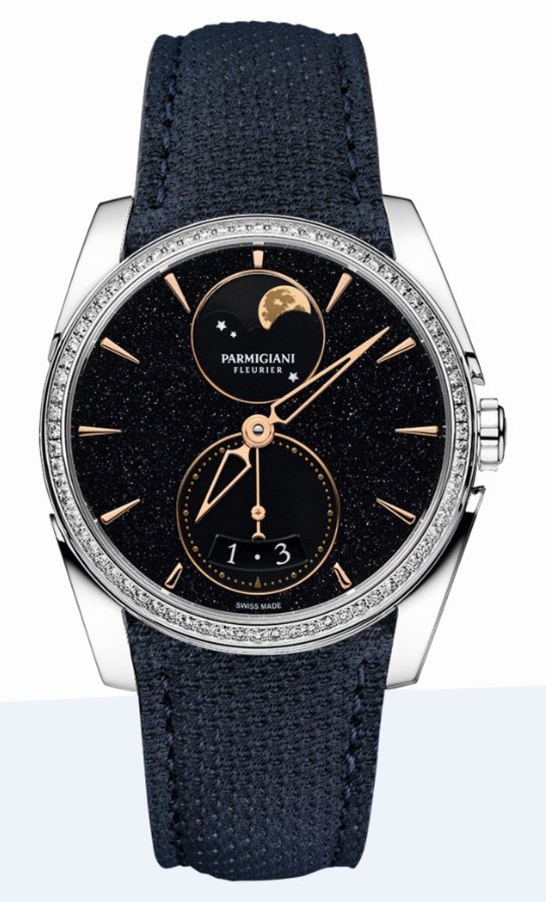 Отличные новости: такими часами можно взаимно обмениваться, исходя из вечернего лука! Романтикой звездного неба модель Tonda Metropolitaine Seline  обязана циферблату из авантюрина. Мелкие золотые частички разбросаны на нем в виде звезд. Модуль указателя фазы луны - это не просто декор. Он и механизм PF318 были полностью разработаны в стенах Parmigiani Fleurier.