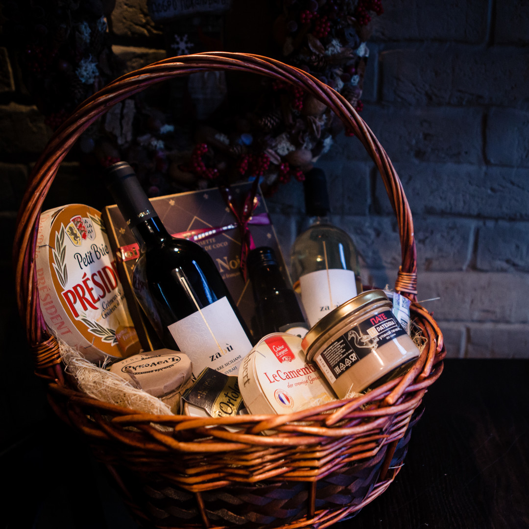 Еще один вариант сюрприза от заведения – подарочная корзина. Они здесь есть в готовом варианте, но можно заказать также индивидуальное исполнение. В состав такой корзины может входить: вино, крепкий алкоголь, сыры, колбасы, прошутто, паштеты, ассортимент оливок и маслин, бальзамико, оливковое масло Extra Virgin, мармелад, вяленые томаты, печенье ручной работы, книги о винах и кулинарии. Именно здесь предлагают большой выбор сыров: швейцарский полутвердый сыр Tête de Moine, традиционный Gruyère, а также сыр Савье с ярким ореховым вкусом. Стоимость подарочной корзины – от 2000 рублей. Доставка может осуществляться при покупке на сумму от 7000 рублей.