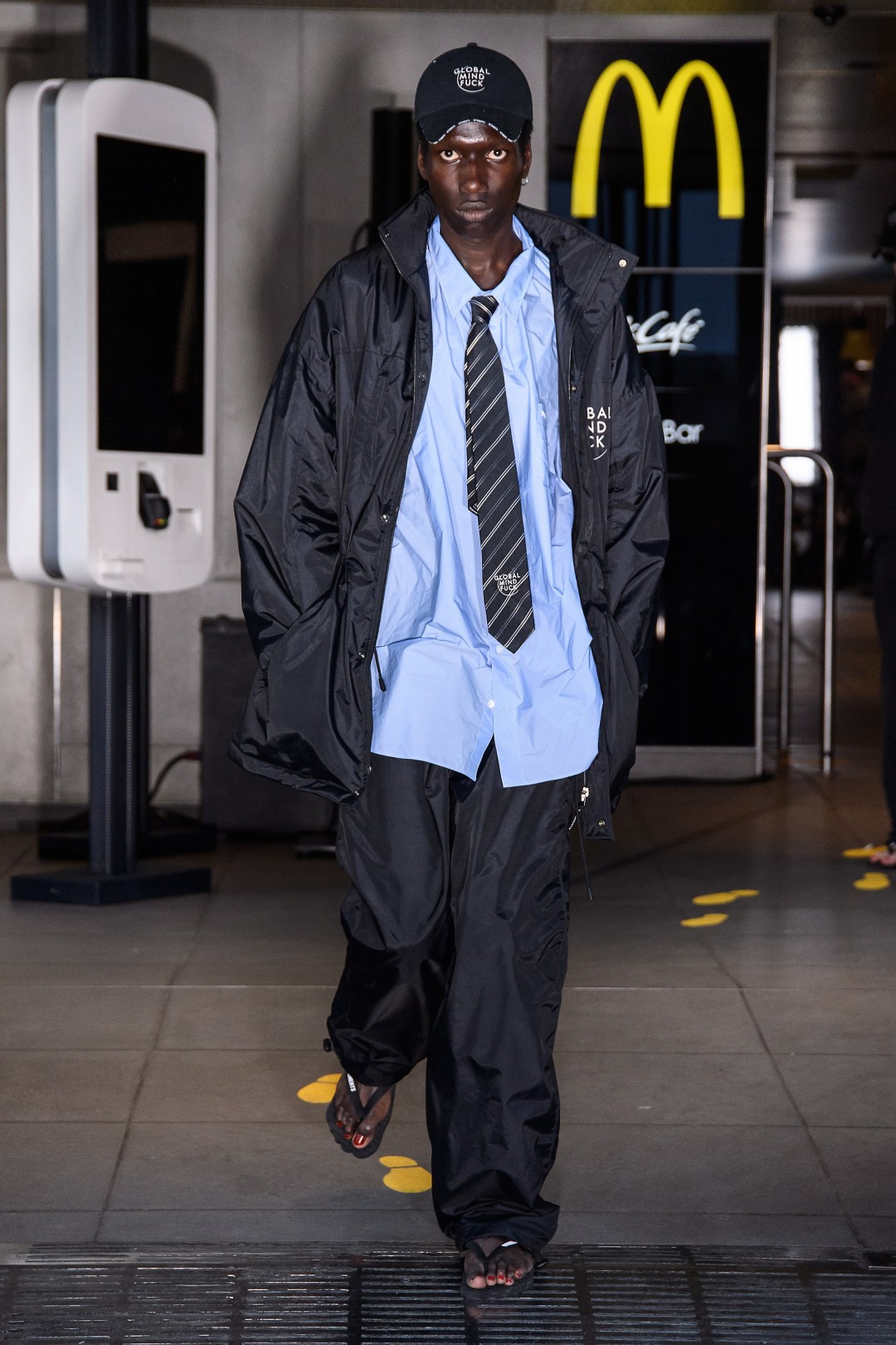Не обошлось и без стирания гендерных границ, которые у Vetements в принципе всегда были размыты: перед зрителями, рассаженными за столиками «Макдональдса» и ожидавшими свою картошку фри, прошлись женщины с накладными усами и мужчины с накрашенными ногтями. Неоновый маникюр можно было увидеть благодаря брендированным вьетнамкам — такие же дизайнер выпускал в рамках своих коллекций для Balenciaga.