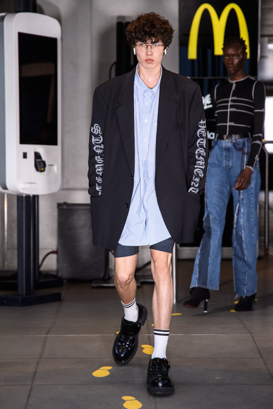 Вчера в одном из парижских «Макдональдсов» прошел показ весенне-летней коллекции Vetements. Модели перевоплотились в сотрудников и посетителей ресторана быстрого питания: невыспавшегося полицейского (в соответствующей экипировке), простого первокурсника (в рубашке, велосипедках и с AirPods), типичного айтишника (в футболке с логотипом браузера Internet Explorer), освобожденного преступника (в оранжевом комбинезоне с надписью «Капитализм») и даже сбежавшую невесту (в платье с фатой и рюшами).