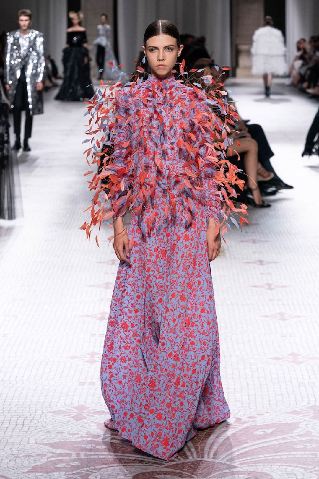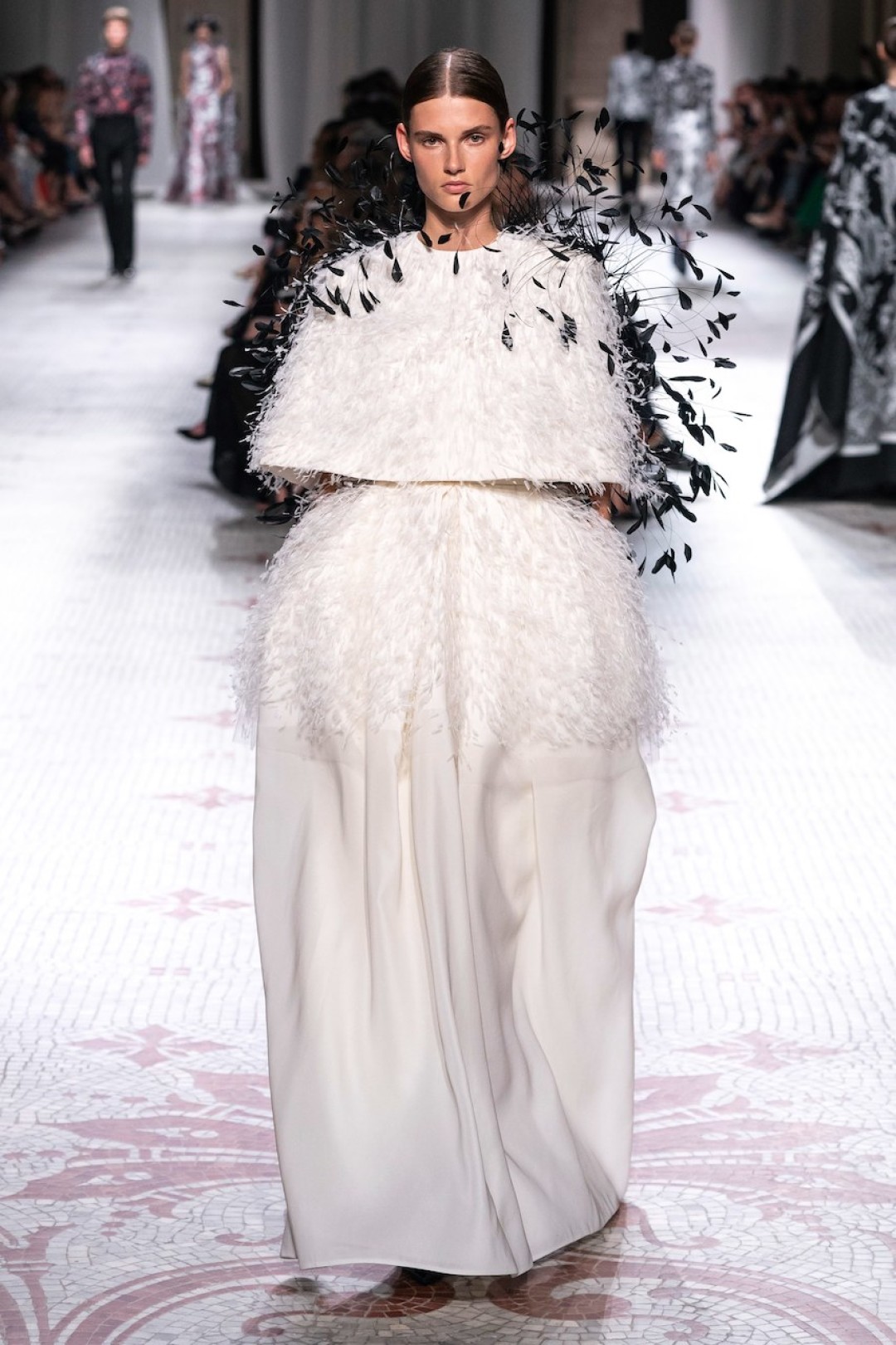 Также в линейку вошли два свадебных платья: одно — силуэта «русалка», расшитое белыми перьями на подоле, второе — из многослойного плиссированного шелка. Кстати, перья стали основным элементом декора в коллекции: они появились не только на нарядах, но и на обуви, украшениях и в прическах моделей. Видимо, по версии Givenchy, по замку в этот вечер прогуливалась принцесса-лебедь.